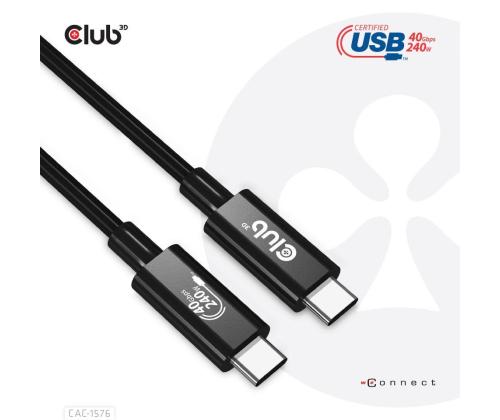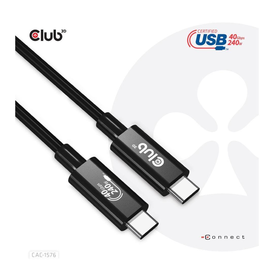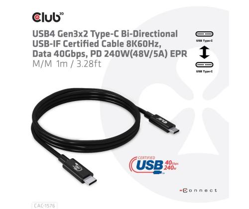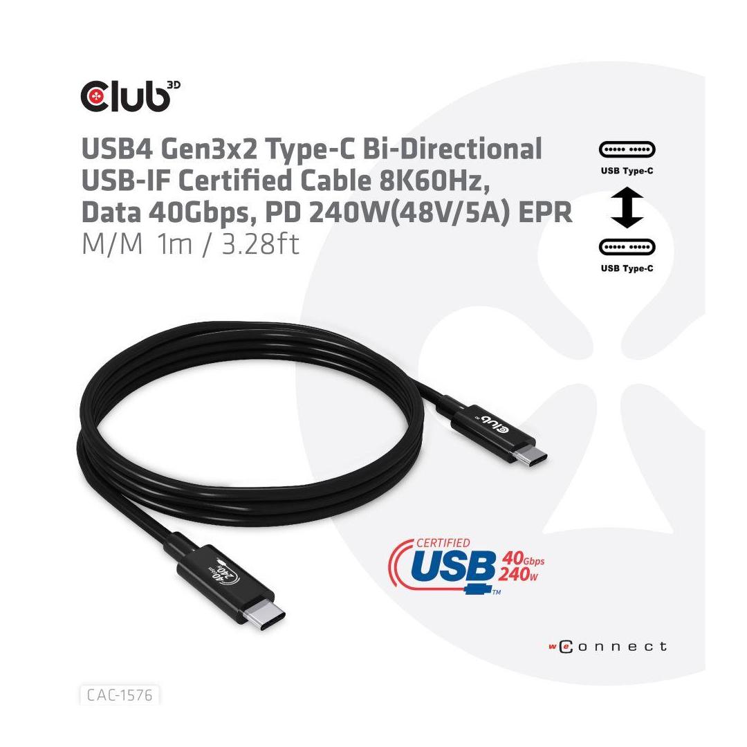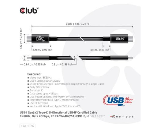 The Club 3D CAC-1576 USB4 Gen3x2 Type-C Bi-Directional USB-IF Certified Cable 8K60Hz, Data 40Gbps, PD 240W(48V/5A) EPR M/M 1m / 3.28ft connects your Notebook, Tablet or Phone with USB4 Type-C output to your favorite existing Peripherals, Accessories and Chargers. It enables Video,Data and Power over a single cable and both ways. This cable supports USB4 Gen3x2 Type-C Bi-Directional Video 8K60Hz, Data 40Gbps, PD 240W(48V/5A) EPR M/M 1m / 3.28ft output for Downstream charging or powering your Notebook, Tablet or Smartphone and is USB-IF Certified.
