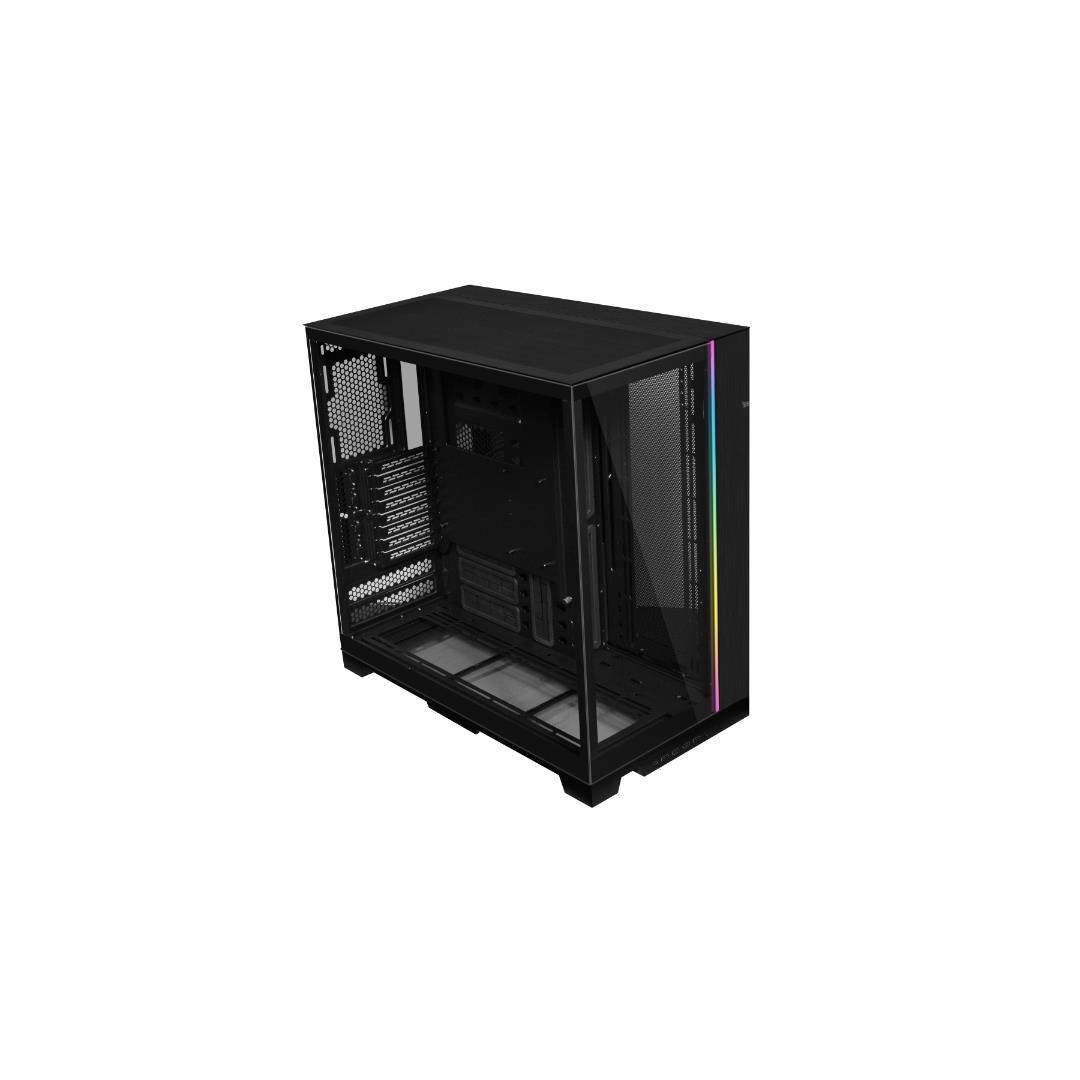 Karkaistut lasipaneelit edessä ja sivuilla, joissa on irrotettava pilarit, jotta komponentit ja RGB-valaistus näkyvät saumattomasti