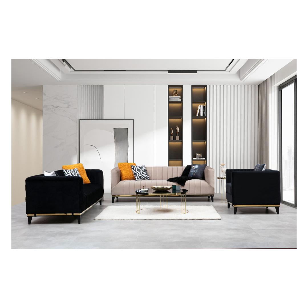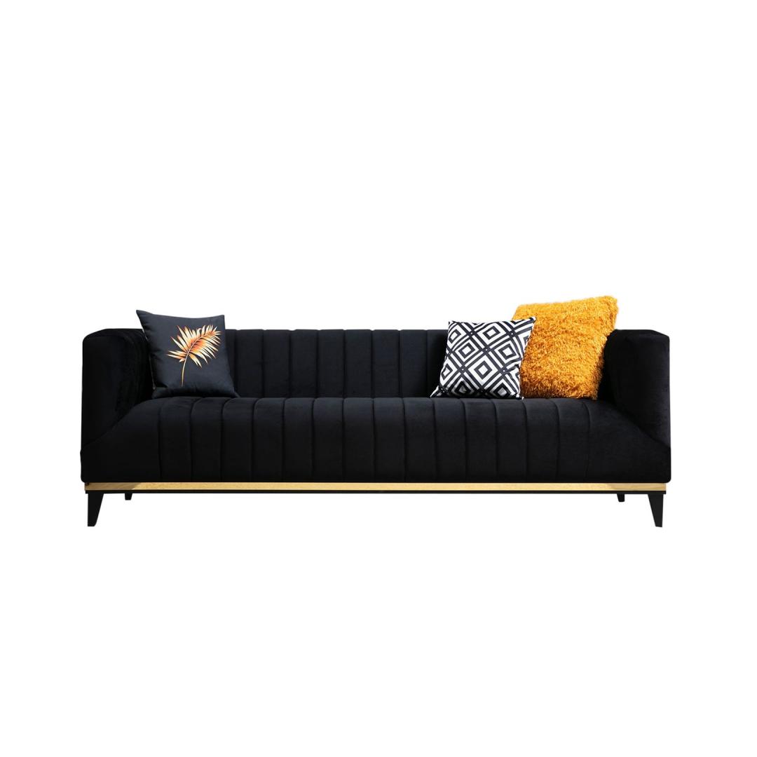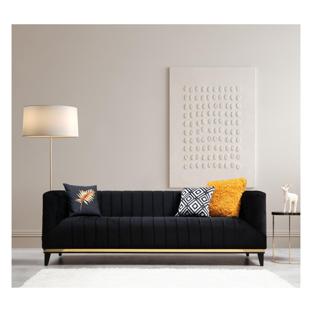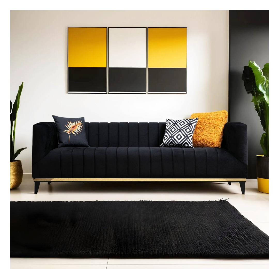 Tutvustame meie luksuslikku 3-kohalist diivanit, mille eesmärk on tuua teie koju glamuuri ja elegantsi. See diivan on oma elegantse musta ja kuldse värvilahendusega rafineerituse kehastus. Lõbutsege luksusesMuutke oma elutuba meie 3-istmelise diivaniga luksuslikuks puhkekohaks. Selle glamuurne kontseptsioon, mis on inspireeritud tipphotellidest, tõstab koheselt iga ruumi stiili.Päratu mugavusVajutage meie diivani pehmedesse padjadesse ja kogege võrratut mugavust. 8 cm 28 dns hall vahtpolster ja 5 cm 24 dns sulged pakuvad täiuslikku tasakaalu toe ja pehmuse vahel, mis tagab tõeliselt mõnusa istumiskogemuse. Fikseeritud istumis- ja seljapadjad tagavad, et teie diivan säilitab oma kuju ja mugavuse aastaid. Tiisikas ja praktilineMeie 3-kohaline diivan ei ole mitte ainult väljapaistev ese, vaid see on disainitud ka praktilisust silmas pidades. Kuivpuhastatav kangas teeb selle hooldamise lihtsaks ja hoiab selle puhtana. Kaks kaasasolevat padjakest, mis on täidetud vahtplastist ja silikoonvahust kombinatsiooniga, lisavad lisamugavust ja stiili. Kvaliteetne käsitööTugeva pöögipuidust ja puitlaastplaadist raamiga valmistatud diivan on valmistatud kestma. Mustad puidust jalad koos kuldse plastribaga ei taga mitte ainult stabiilsust, vaid lisavad ka elegantsi üldisele disainile. Tehnilised üksikasjad:Raam: Puit: Pöögipuit / puitlaastplaatKangas: Materjal: 100% polüesterPikkus: 222 cmLaius: 89 cmKõrgus: 75 cmVaht: 8 cm 28 DNS hall vaht + 5 cm 24 DNS sulega istumiseks.60% Snipe Foam / 40% Silicone Foam seljale2 padjakest kaasa arvatudPadjad: 60% Snipped Foam / 40% Silicone Foam: 60% Snipped Foam / 40% Silicone FoamFikseeritud istumis- ja seljapadiKuivpuhastatav kangasJalad: Mustad puidust jalad kuldse plastribagaVärv: Must ja kuldne Värv: Black Gold