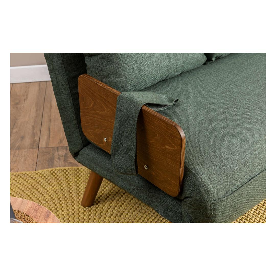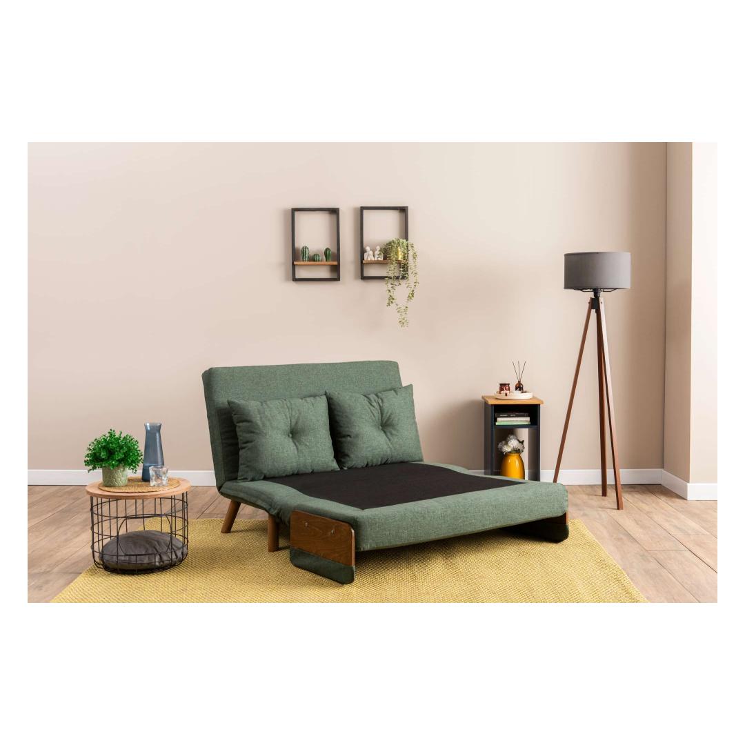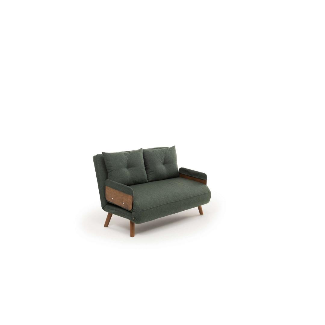 Measuring at 78 cm x 120 cm x 82 cm as a sofa and 190 x 120 cm as a bed, this 2-seat sofa-bed is the perfect space-saving solution for any home. The sleek green color adds a pop of personality to your decor, while the wooden armrests provide a touch of elegance to the modern design.