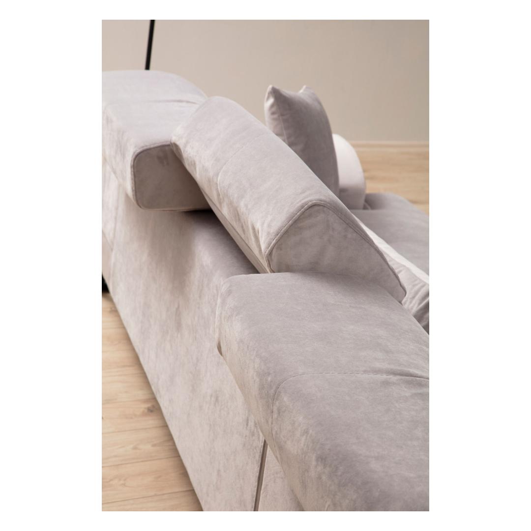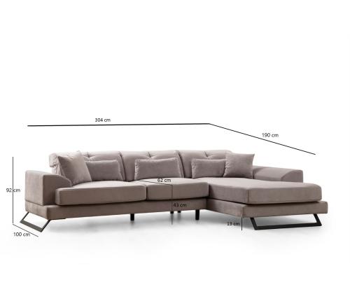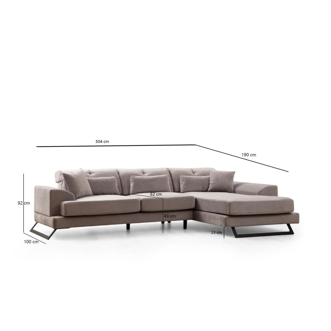 Muuda oma eluruum meie kauni nurksofa abil helesinises. See diivan on valmistatud lehtpuust ja puitlaastplaadist, olles mitte ainult stiilne, vaid ka vastupidav. 100% polüestrist kangas lisab sinu kodu sisustusele elegantsi.Mugavus ja stiil koosReguleeritav seljatoe mehhanism võimaldab sul kohandada oma istumiskogemust, samas kui 28 DNS pehme hall vaht ja 24 DNS sule/vedru kombinatsioon tagavad maksimaalse mugavuse. 60% lõigatud vaht ja 40% silikoonvaht seljatoe padjad pakuvad ideaalset tuge seljale.Ideaalne lõõgastumiseks140 cm sügavusega iste ja 70 cm käetoe sügavus teevad sellest diivanist ideaalse koha lõõgastumiseks pärast pikka päeva. Kaasaskantav istmepadja ja fikseeritud seljatoe padja kombinatsioon lisab sinu istumispaigutusele mitmekesisust.Kergesti hooldatavKuivpestav kangas muudab diivani värske ja uue välimuse säilitamise lihtsaks. Matt must metalljalad lisavad kogu disainile modernset puudutust.Uuenda oma elutuba meie nurksofa abil ja koge mugavuse ja stiili ideaalset segu. Tellige oma täna ja tõstke oma kodu sisustus uuele tasemele!Tehnilised andmed:Raam: Lehtpuu / PuitlaastplaatKangas: 100% PolüesterPikkus: 190 cm x 304 cmLaius: 100 cmKõrgus: 92 cmJala kõrgus: 13 cmIstme kõrgus: 43 cmIstme sügavus: 62 cmVaht kõrgus: 18 cmJalad: Matt must metalljaladVärv: HelehallPadi suurus: 45 cm x 45 cm (2 tk), 65 cm x 30 cm (3 tk) Värv: Light Grey