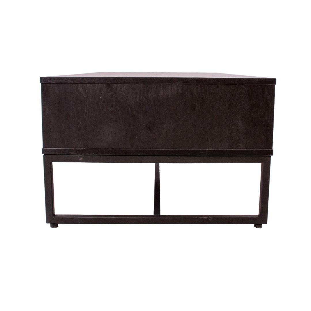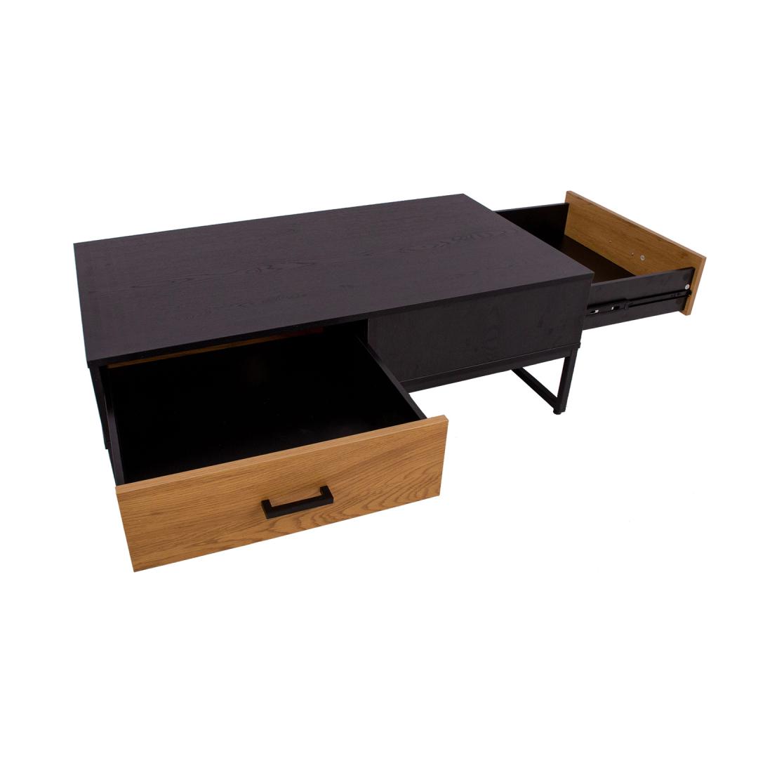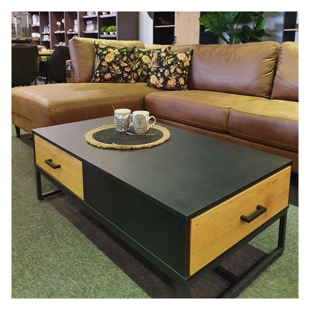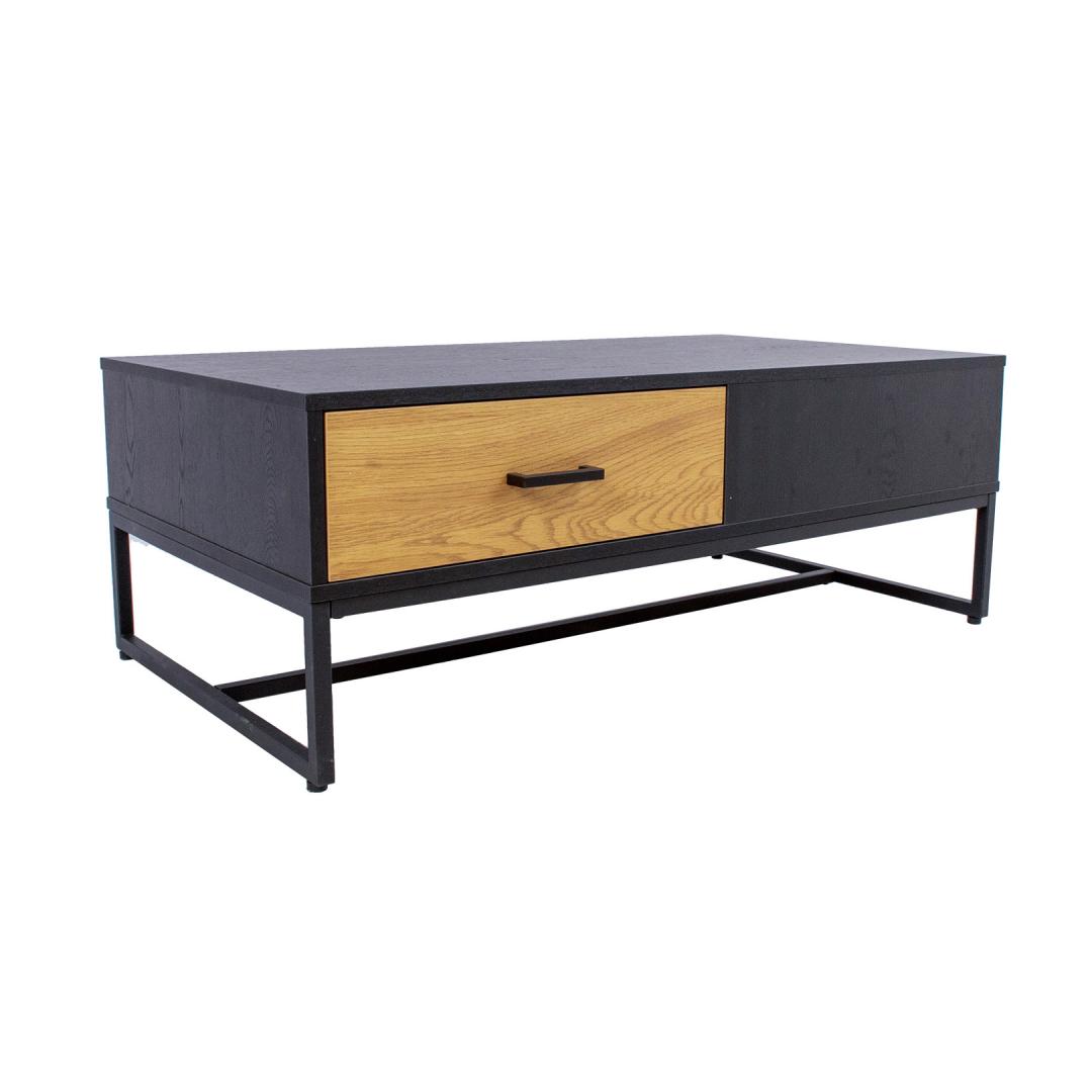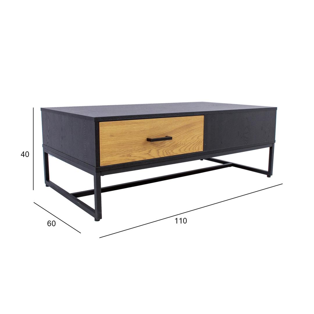 Coffee table AMSTERDAM 110x60xH40cm. Material: melamine board, color: oak/black. Black metal base frame. Soft closing drawer glides. Black aluminum handles.