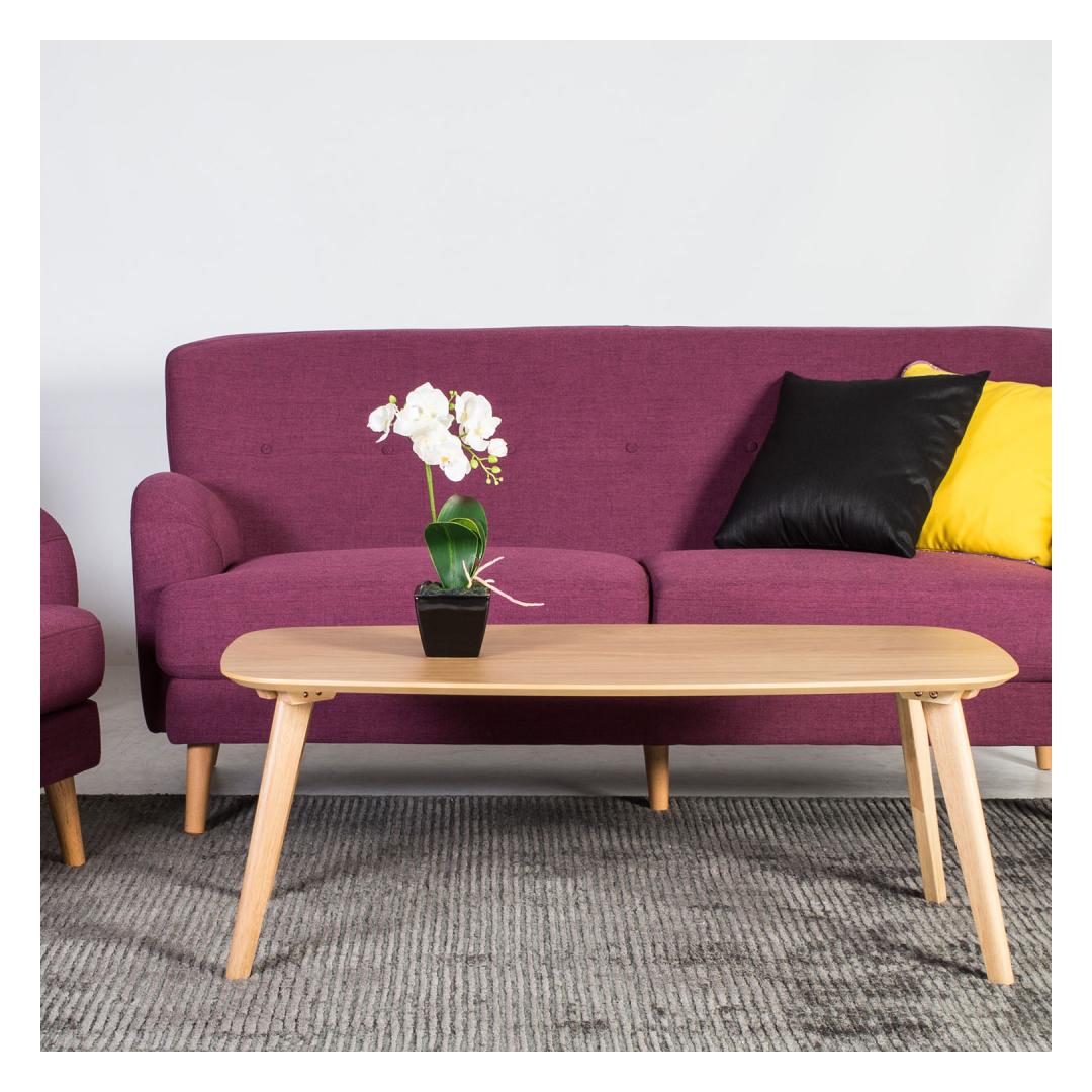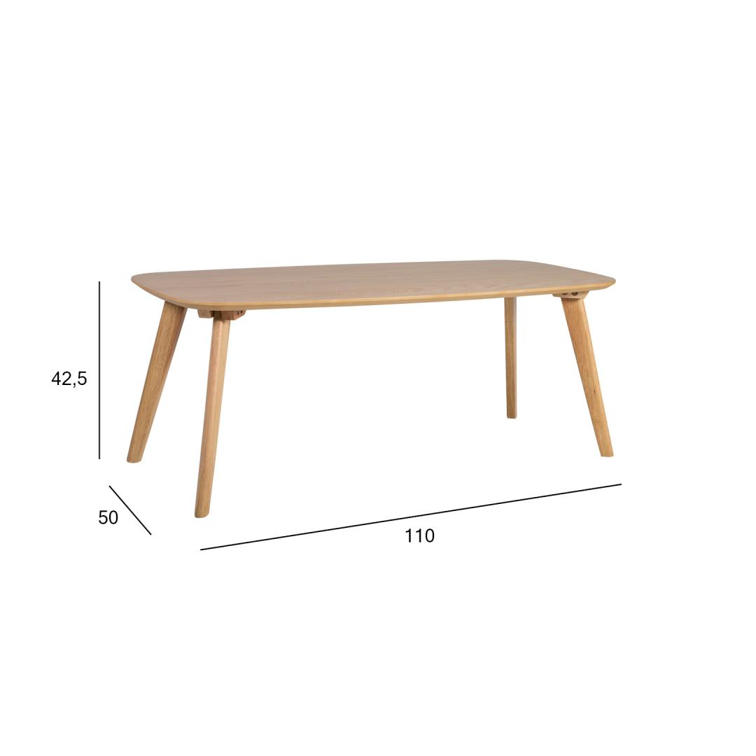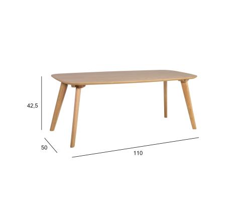 Diivanilaud DAHLIA 110x50xH42,5cm. Lauaplaat: 18mm MDF naturaalse tammespooniga, jalad ja jalad ja raam on valmistatud kummipuust. Laud on viimistletud läbipaistva lakiga.