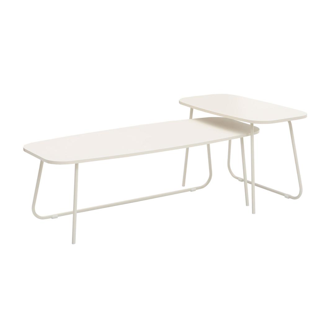Pöytien jalat ja rungot ovat metallia ja ne on viimeistelty beigellä jauhemaalilla. Sohvapöytä DUO 2 kpl 120x48xH40cm, 75x40xH48cm, vaalea puu/beige.