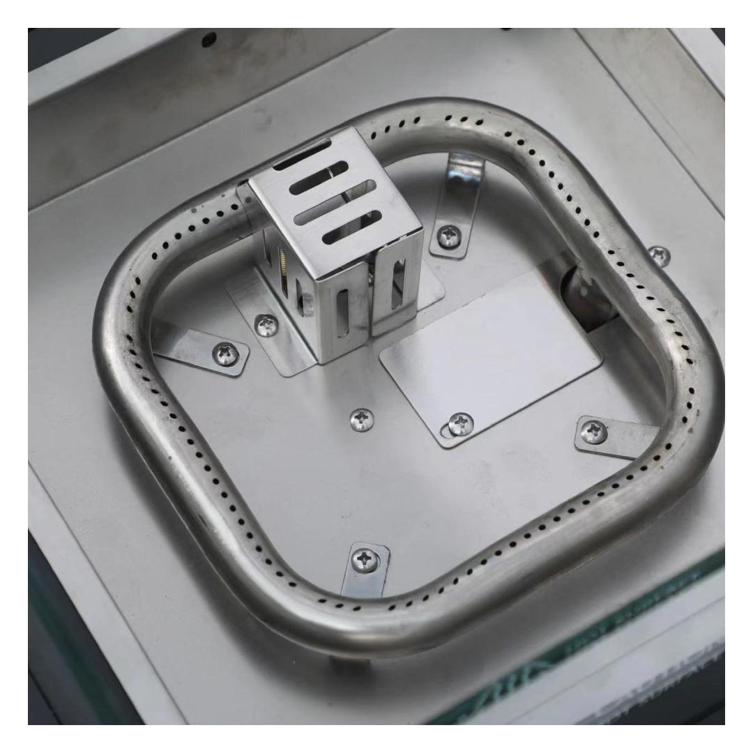 Ruostumattomasta teräksestä valmistettu poltin 340 x 340 x 198 mm.