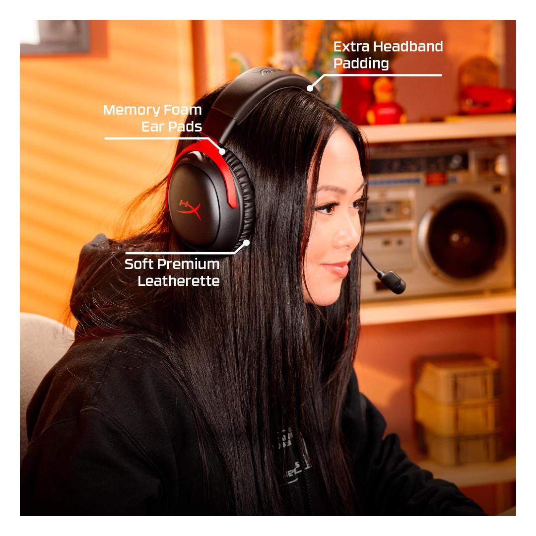 • Mukavuus on Cloud III:n DNA:ssa. HyperX:lle ominainen memory foam -muistivaahtomuovi kuulokepannassa ja pehmeään, ensiluokkaiseen keinonahkaan käärityt korvatyynyt takaavat muhkean ja mukavan istuvuuden joka puolella.