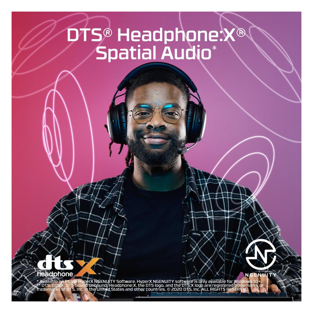 [3] Available on PC via HyperX NGENUITY Software. DTS, DTS:X, DTS Sound Unbound, Headphone:X, the DTS logo, and the DTS:X logo are registered trademarks or trademarks of DTS, Inc. in the United States and other countries. © 2020 DTS, Inc. ALL RIGHTS RESERVED.