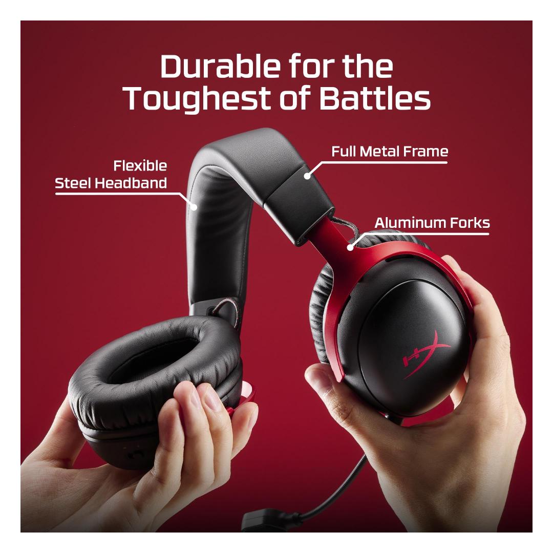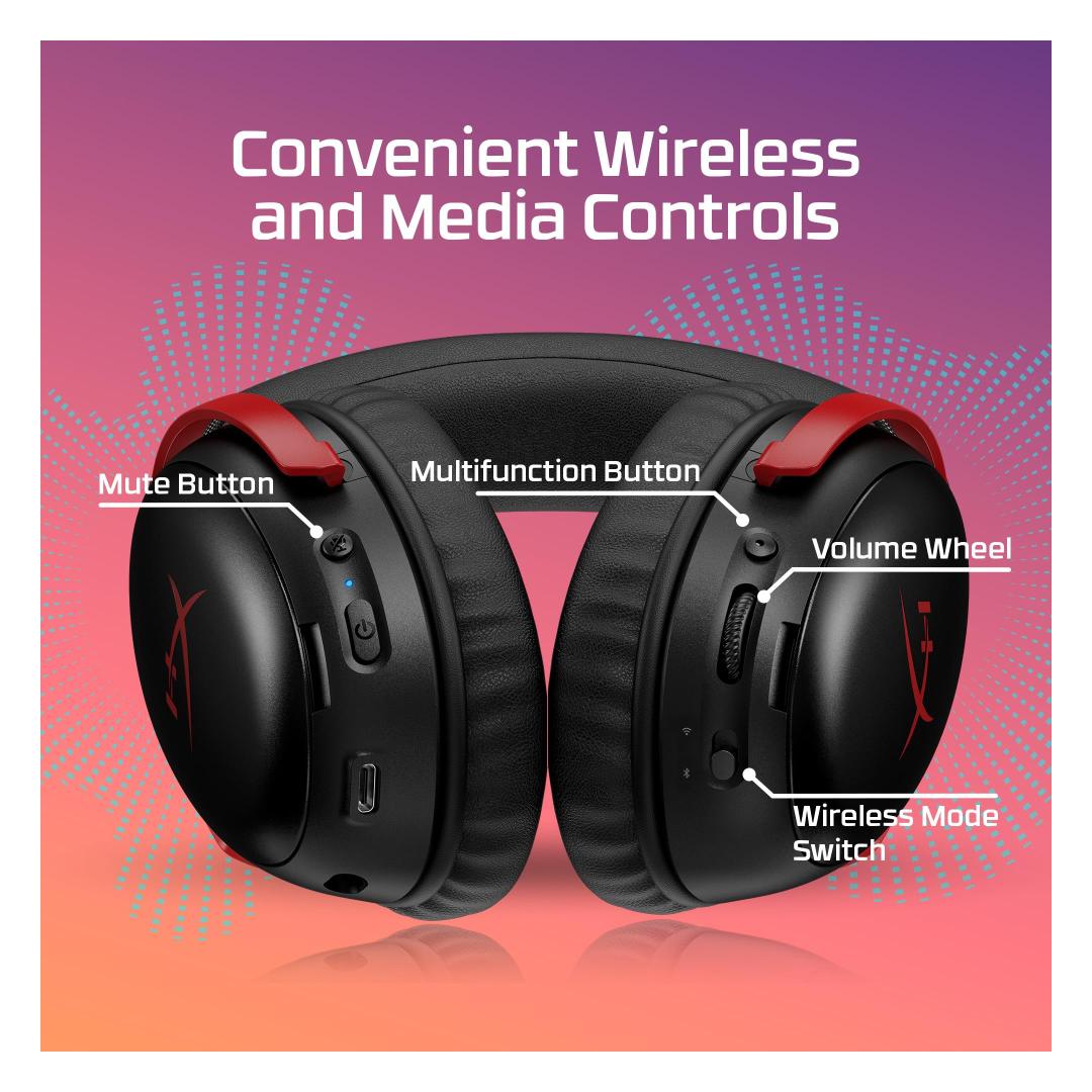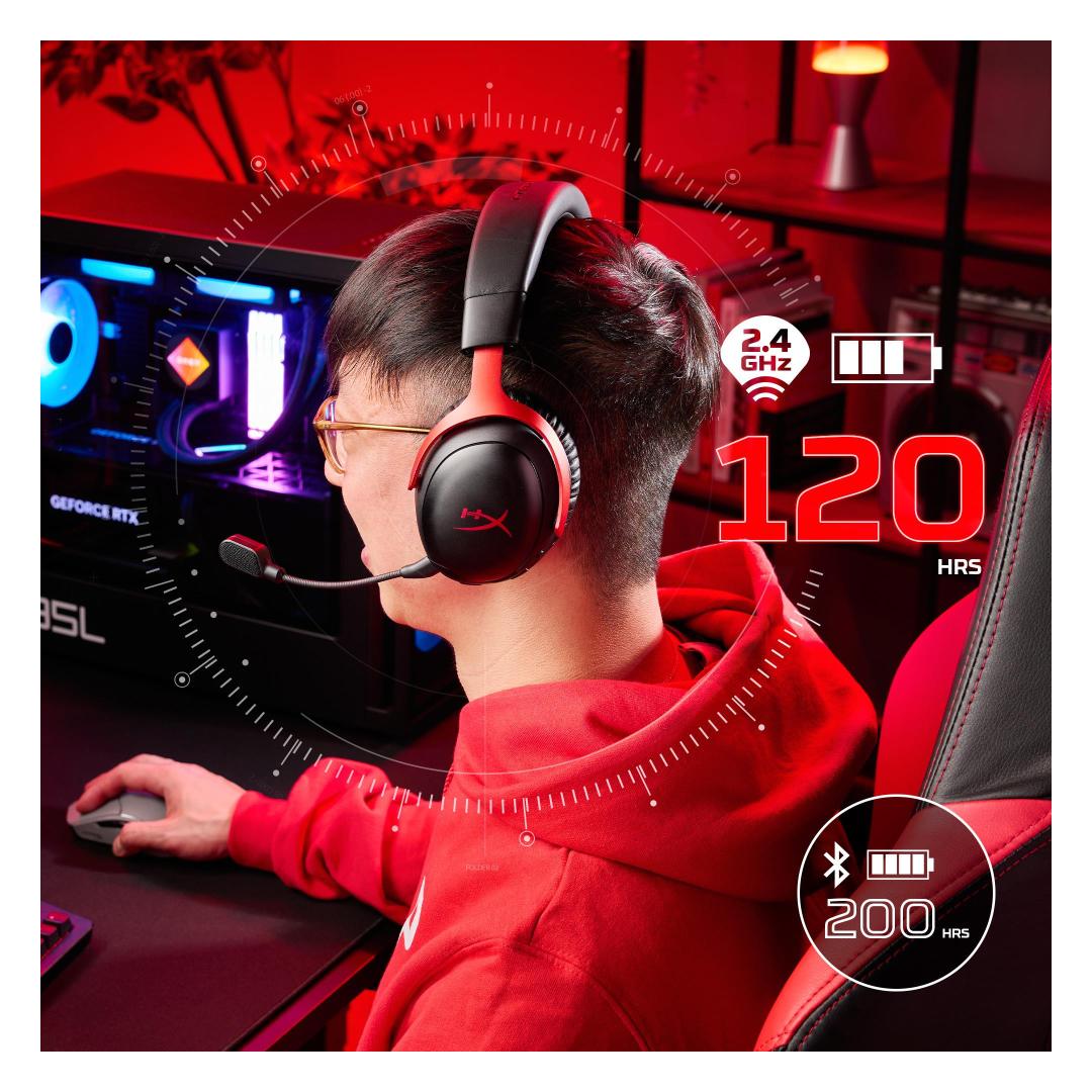 Achieve up to 120 hours of gameplay on 2.4GHz. Push the limits even further with up to 200 hours in Bluetooth Mode[1].Gain the convenience and versatility of wireless freedom with 2.4GHz wireless or Bluetooth connectivity. Instant Pair[2] is also available with select OMEN gaming laptops, no dongle required.Angled 53 mm drivers have been tuned by HyperX audio engineers to provide an optimized listening experience that accents the dynamic sounds of gaming.Comfort is in the Cloud III’s DNA. HyperX signature memory foam in the headband and ear cushions wrapped in soft, premium leatherette make for a plush, comfortable fit all around.The versatile detachable 10mm boom mic features an LED mic mute indicator and a built-in mesh filter to capture high-quality audio for clear voice chat and calls. Use the boom mic in both 2.4GHz or Bluetooth modes for optimal mic performance or go boomless for convenience.A lifetime activation of DTS Spatial Audio3 will help amp up your audio advantage and immersion on PC with its precise sound localization and virtual 3D sound stage.The headset is flexible and features an aluminum frame so it’s resilient against travel, accidents, mishaps, and routine wear and tear.Take command of your audio experience with intuitive controls, including a wireless mode selector, volume wheel, mute button, and multi-function button for convenient media playback and call management.Cloud III S Wireless is compatible with PC, PS5, PS4, Nintendo Switch, Mac, Mobile, and Bluetooth devices[5]. USB-A and USB-C connectors are included for maximum compatibility, no matter how you game.Personalize your headset with removable magnetic earcup plates to match your unique setup. Sold separately and available in select countries/regions.