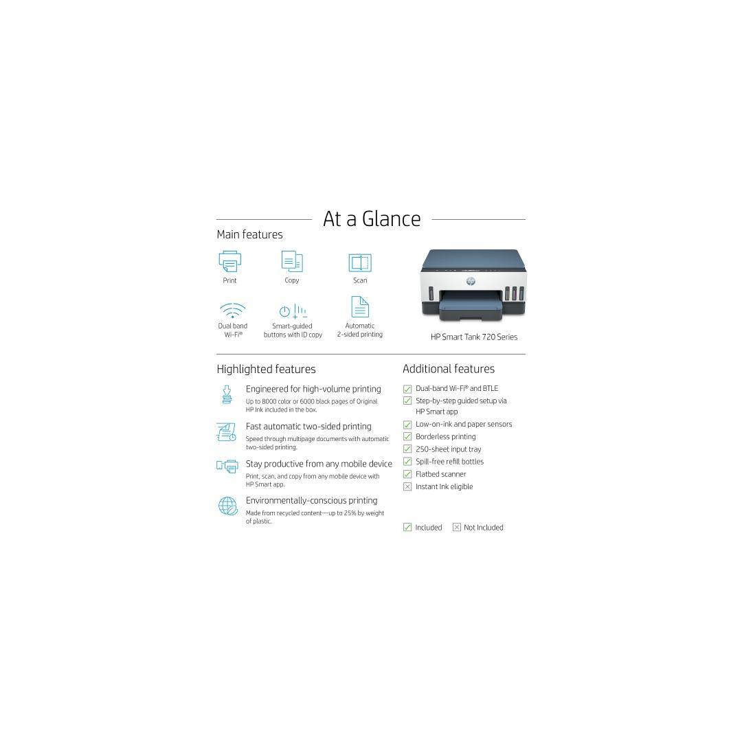 HP Smart Tank 720 AiO -tulostin Mustesuihkutulostin Väri MFP A4 15 ppm USB Wi-Fi
