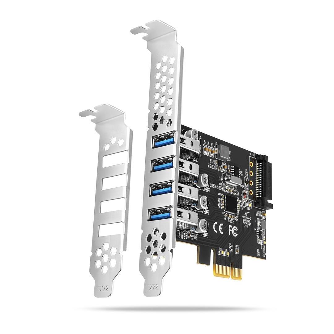 PCI Express -kortti, jossa on neljä ulkoista USB 3.2 Gen1 -porttia, joissa on kaksoisvirta. Renesas-piirisarja. Standardi ja matala profiili.