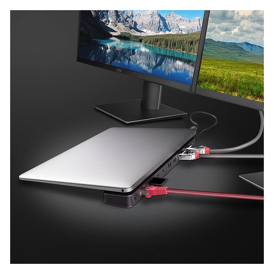 Connects an HDMI® and/or a DisplayPort display, USB peripherals and power over a single cable
