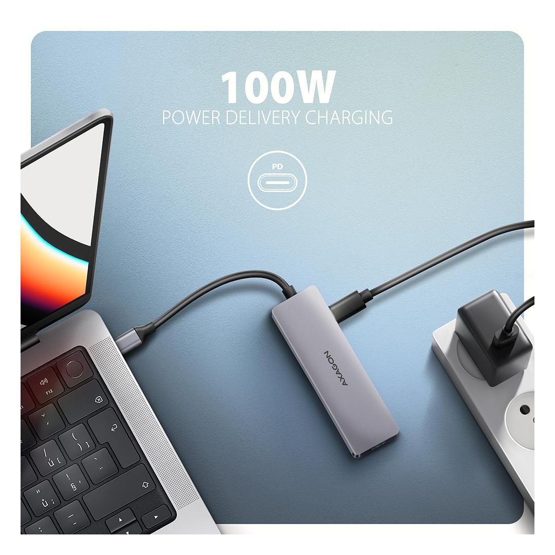 Toinen USB-C (PD) -liitin on varattu vain puhelinten tai kannettavien tietokoneiden lataamiseen Power Delivery 3.0 -tekniikalla jopa 100 W:n teholla. Kytke hubiin sopiva USB-C Power Delivery -laturi ja liitä hubi kannettavaan tietokoneeseen, joka tukee Power Delivery -järjestelmää. Näin säästät yhden USB-C-portin.