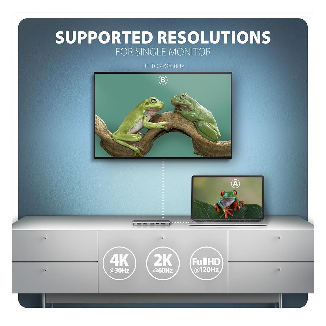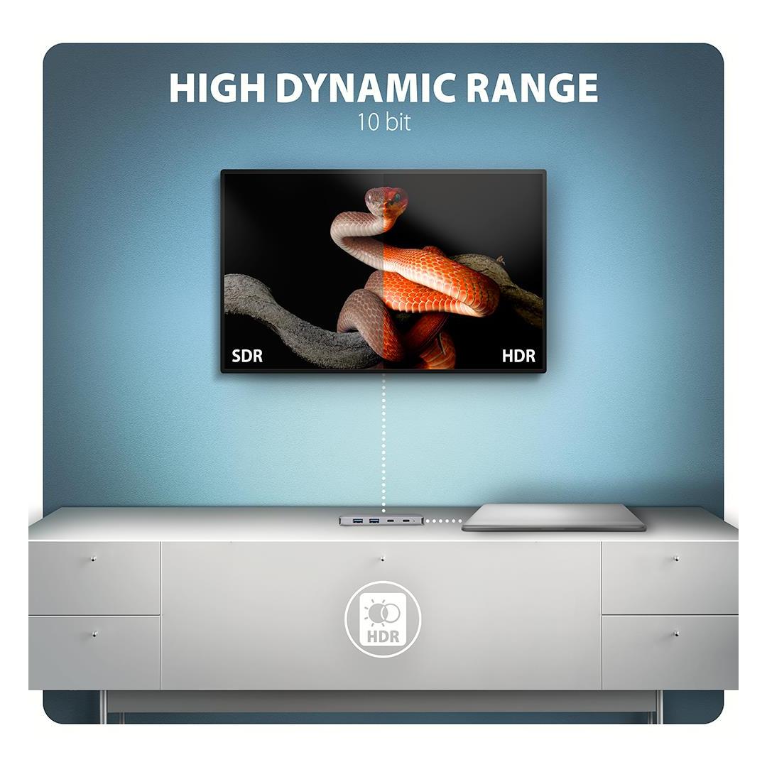 HDMI-lähtö tarjoaa korkealaatuista kuvaa jopa 4K/60Hz Ultra HD -resoluutioon asti ja tukee monikanavaista äänensiirtoa. Myös korkeat taajuudet suosituilla peliresoluutioilla 2K/120Hz tai FullHD/240Hz ovat tuettuja. HDR-tuen (High Dynamic Range) ansiosta voit nauttia huomattavasti laajemmasta väri- ja kontrastivalikoimasta. Jotta videolähdöt toimisivat kunnolla, kannettavassa tietokoneessa on oltava USB-C-portti, jossa on DisplayPort Alternate Mode (DP Alt Mode) -tuki, tai vähintään Thunderbolt 3, 4 -portti.