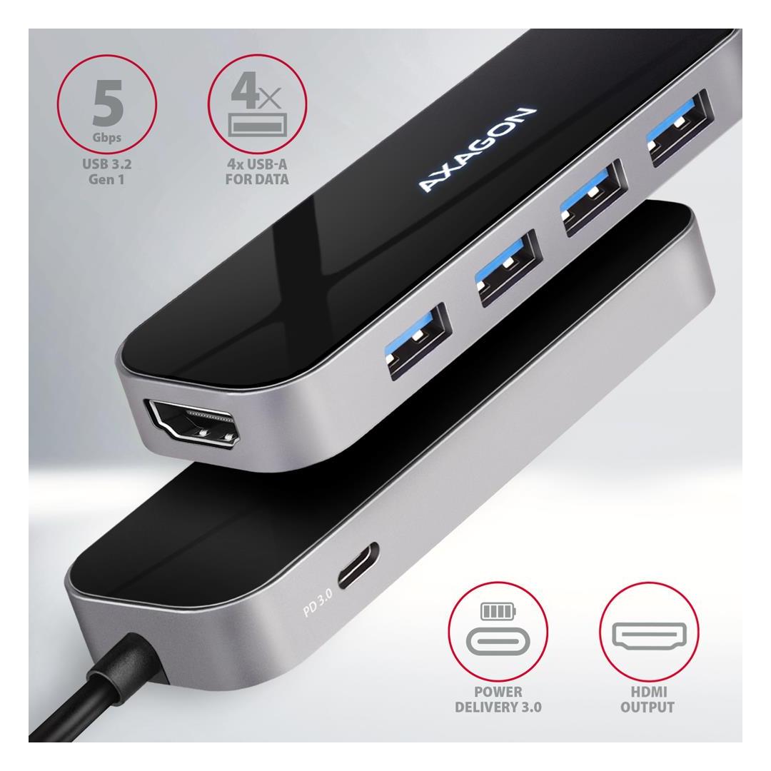 Moniporttinen USB-C 3.2 Gen 1 -keskitin AXAGON HMC-6H4A laajentaa kannettavaa tietokonettasi, tietokonettasi tai puhelintasi kuudella portilla. Voit helposti ja nopeasti liittää jopa neljä USB-laitetta ja HDMI-näytön tietokoneeseen samanaikaisesti kaksipuolisen USB-C-liittimen kautta. Saat myös mahdollisuuden syöttää kannettavan tietokoneen virtaa Power Delivery -tekniikan avulla. USB-C-keskitin tarjoaa sinulle yksinkertaisen ja kompaktin 6in1-telakointiaseman kannettaville tietokoneille, kuten MacBook Prolle.