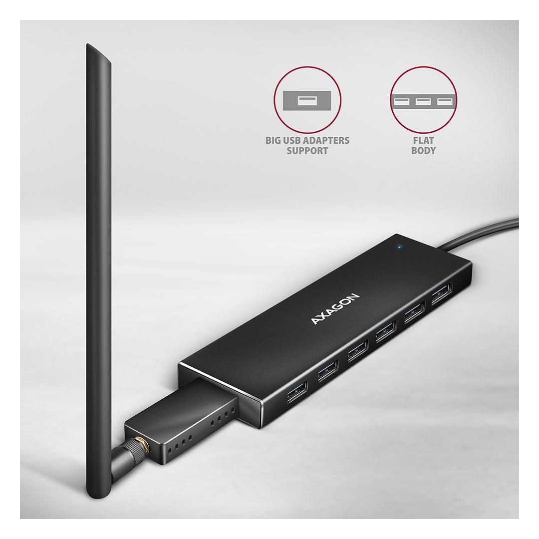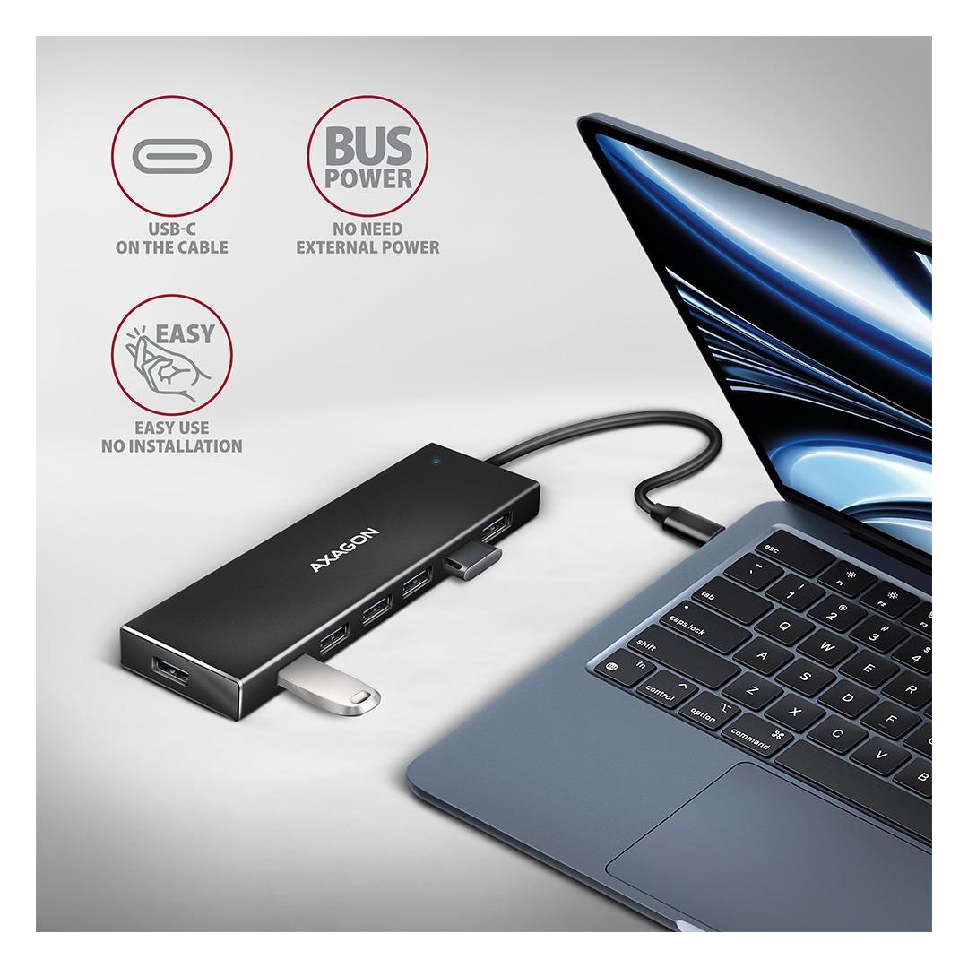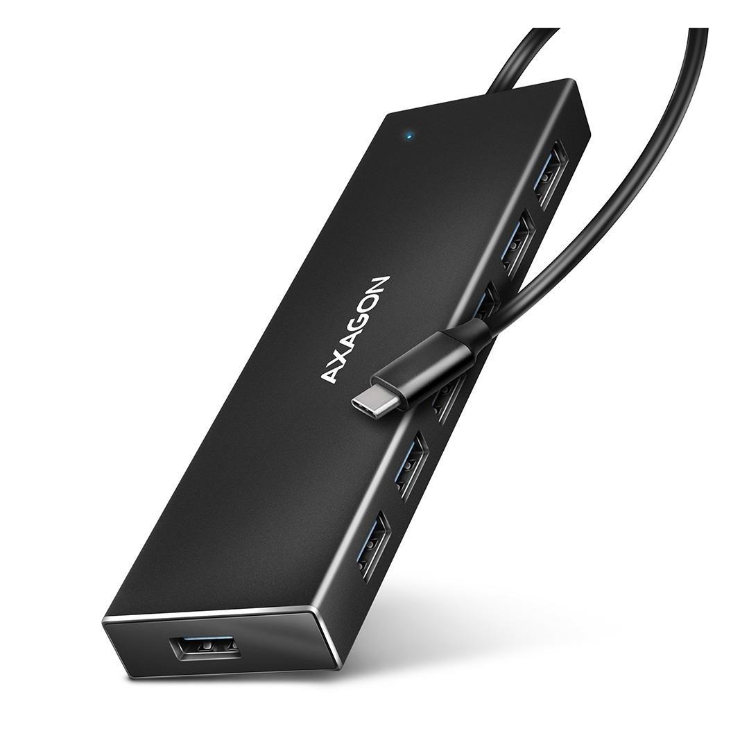 Ohut USB-C 3.2 Gen 1 (USB 3.0) -keskitin AXAGON HUE-F7C, jossa on 30 cm pitkä USB-kaapeli, yhdistää nopeasti ja helposti jopa seitsemän USB-laitetta kannettavaan tietokoneeseen samanaikaisesti. USB 3.2 Gen 1 -standardi mahdollistaa jopa 5 Gb/s siirtonopeuden.