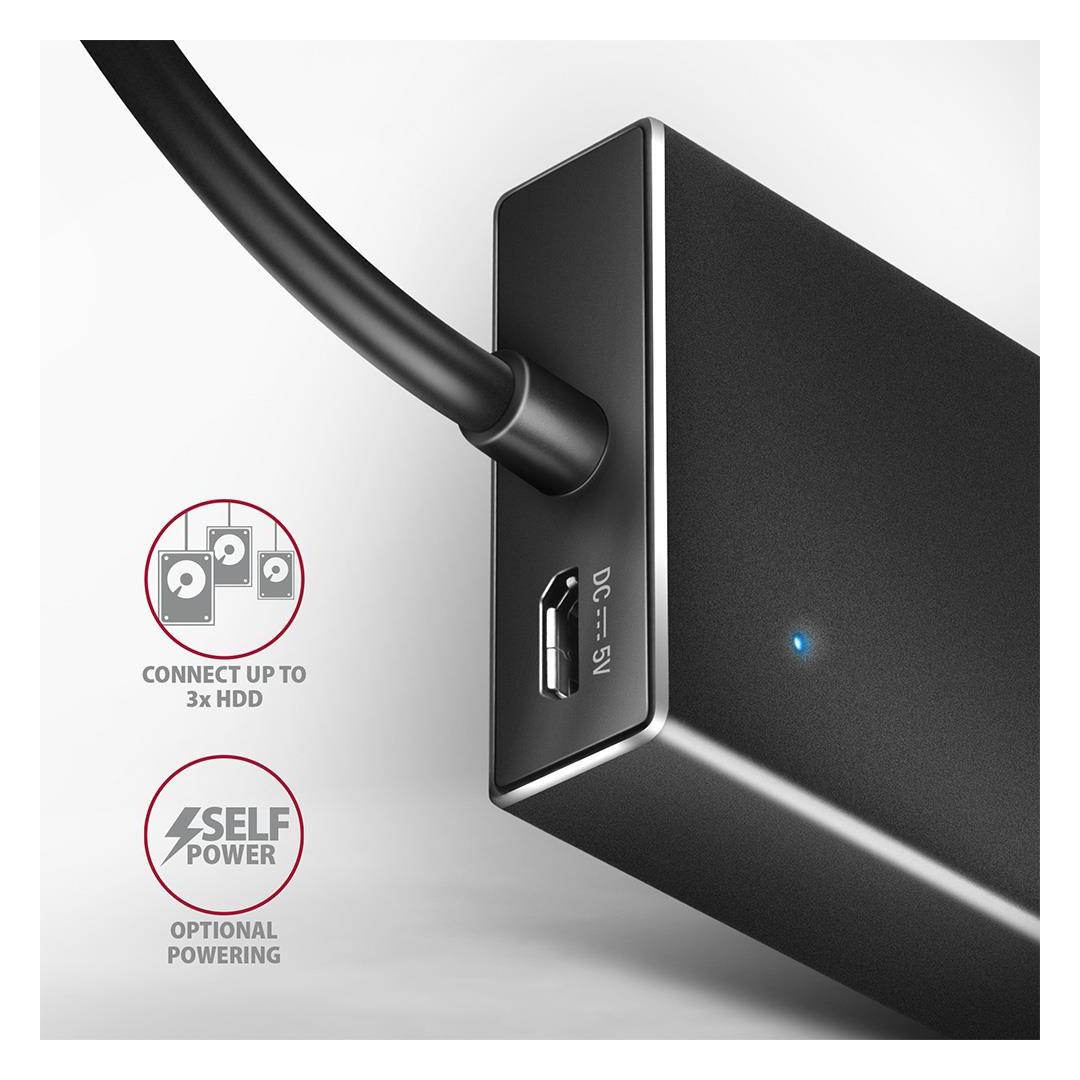 Tämän USB-keskittimen monipuolisuutta lisää myös sisäänrakennettu mikro-USB-liitin, johon saa lisävirtaa matkapuhelinten mukana toimitettavista tavallisista USB-latureista. Tämän lisävirtalähteen ansiosta tietokoneeseen voidaan esimerkiksi liittää entistä enemmän ulkoisia asemia tai lisätä ladattavien matkapuhelinten määrää. Se pystyy käsittelemään useiden ulkoisten asemien pysyvää liittämistä jopa ilman ulkoista virtalähdettä keskittimeen. Ulkoisen virtalähteen kytkemisen jälkeen on mahdollista työskennellä viiden ulkoisen levyn kanssa samanaikaisesti.
