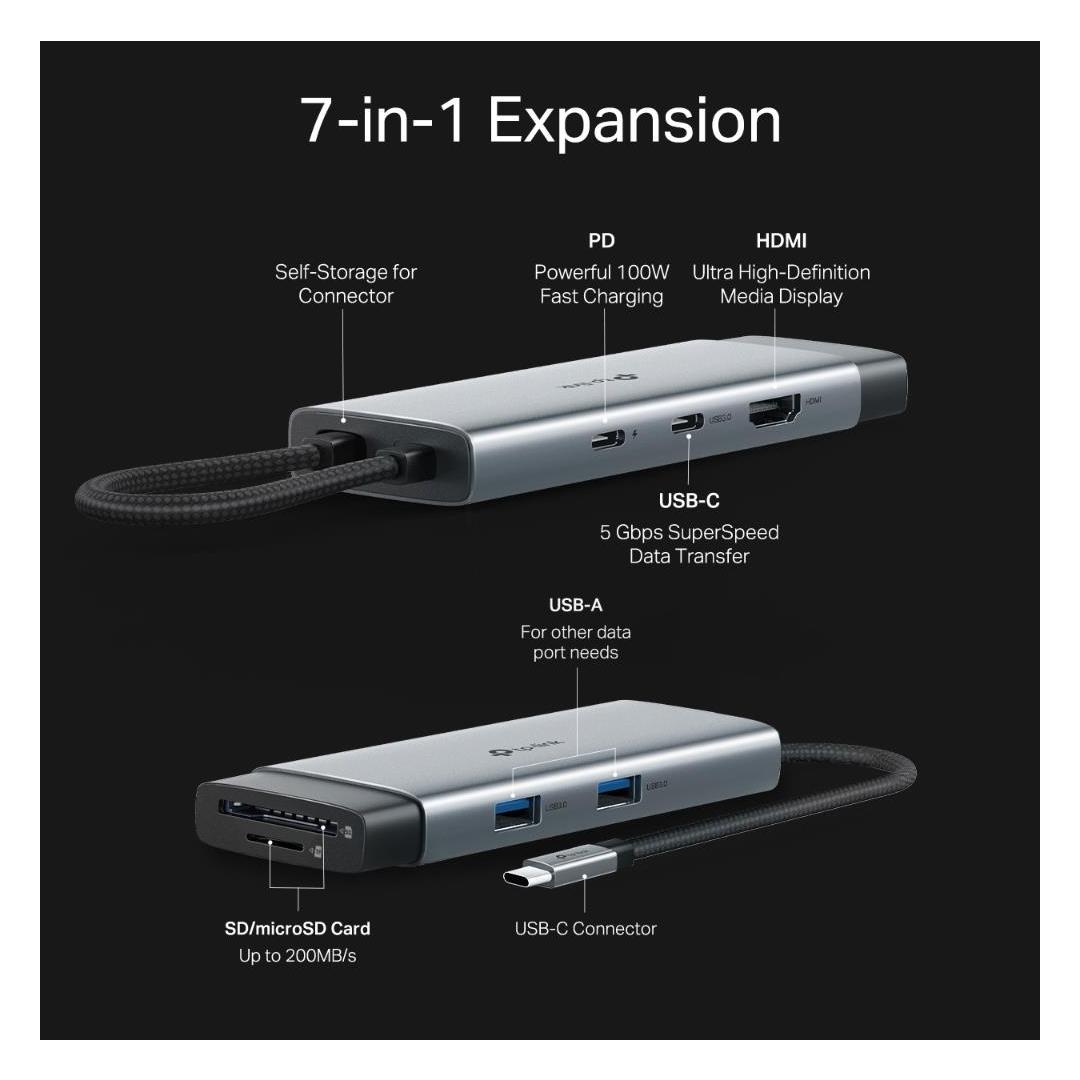 7 in 1 USB-C-keskitin: UH7020C muuttaa yhden USB-C-portin 7 portiksi, joissa on 4K@60Hz HDMI, SD & microSD UHS-I, 100W Power Delivery, 1× USB-C-tietoportti, 2× USB-A-tietoportti.