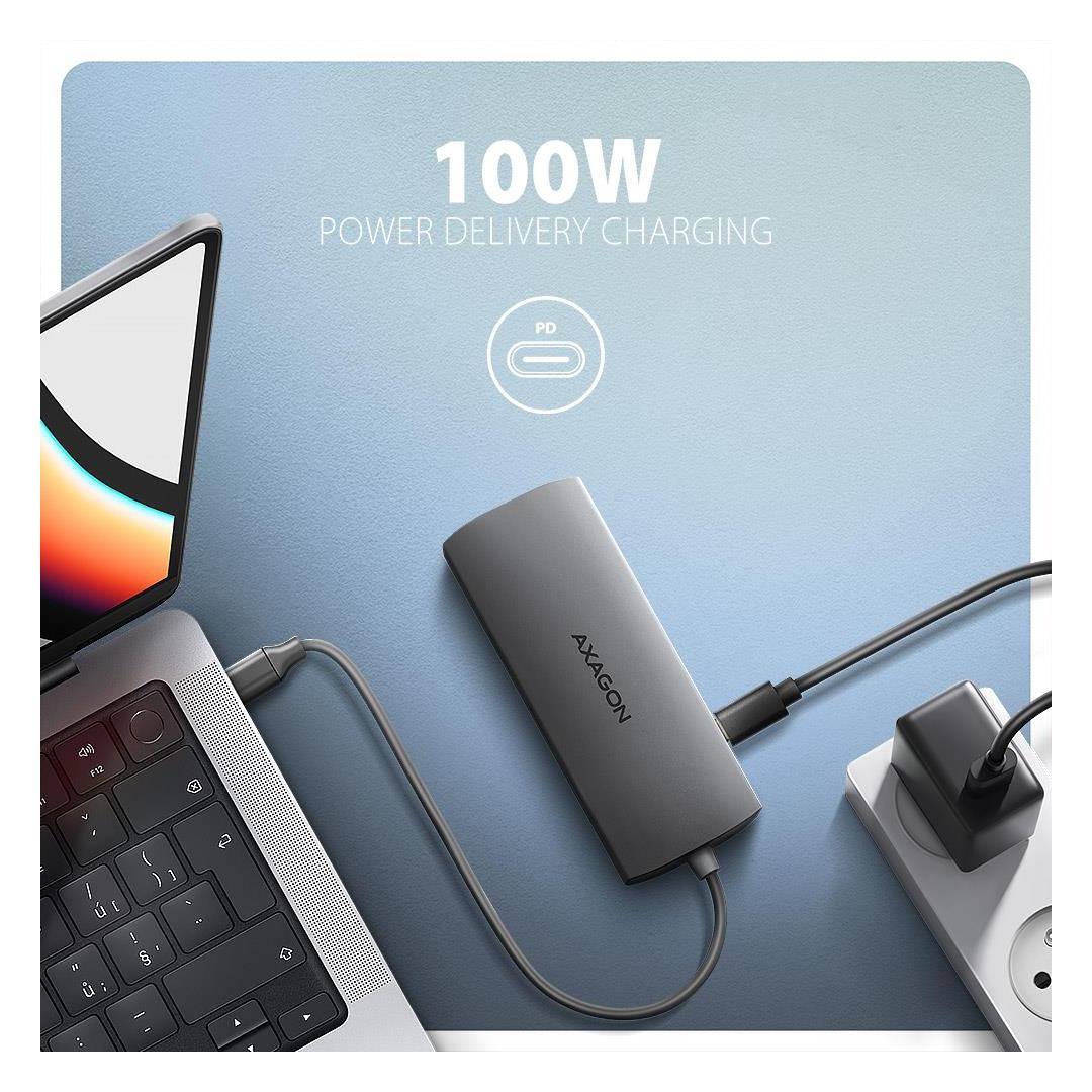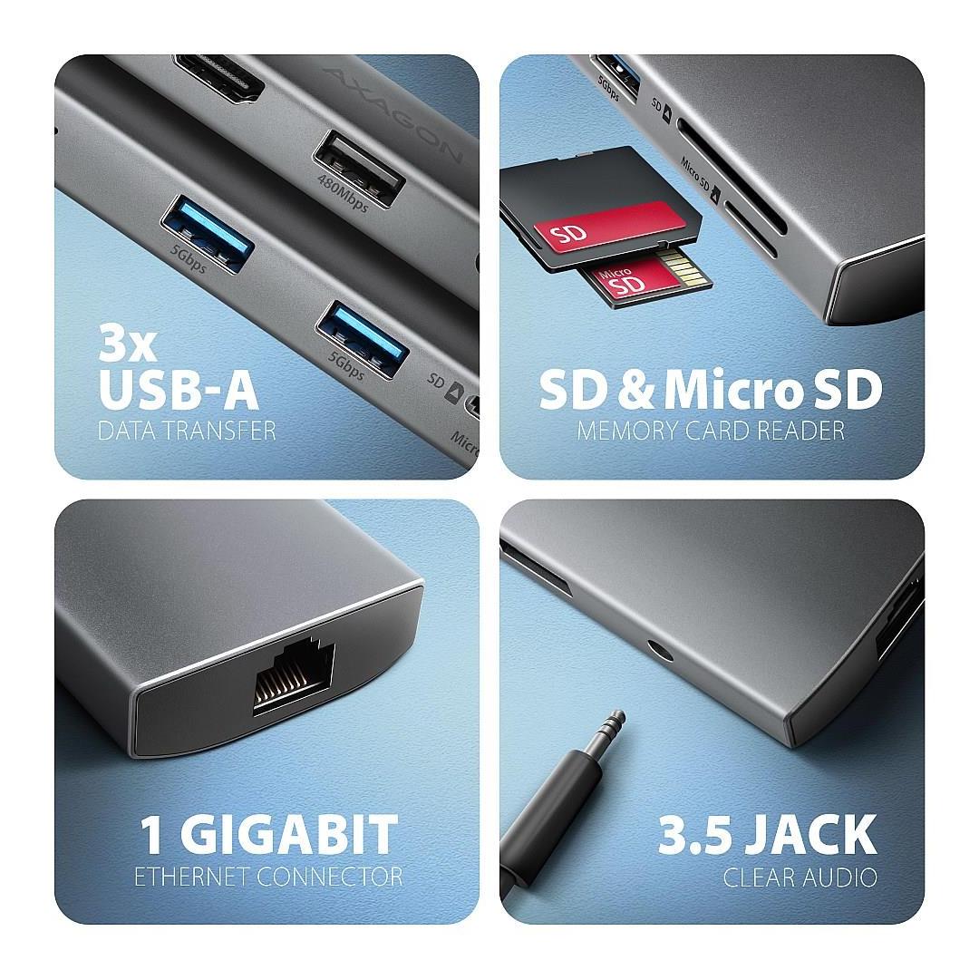 Moniporttinen USB-C 5Gbps AXAGON HMC-8HLSA 9in1 -keskitin laajentaa kannettavan tietokoneen, tietokoneen tai puhelimen yhdeksällä portilla. Voit helposti ja nopeasti liittää monitorin, kolme USB-laitetta, Gigabit Ethernet -verkon, mikrofonilla varustetut kuulokkeet ja SD-kortinlukijan tietokoneeseen samanaikaisesti kaksipuolisen USB-C-liittimen kautta. Saat myös mahdollisuuden syöttää kannettavalle tietokoneelle samanaikaisesti Power Delivery -tekniikkaa käyttäen. Porttikopioija tarjoaa näin yksinkertaisen ja kompaktin 9-in-1-telakointiaseman Windows-kannettavien lisäksi myös Applen kannettaville tietokoneille, kuten MacBook Airille tai MacBook Prolle.