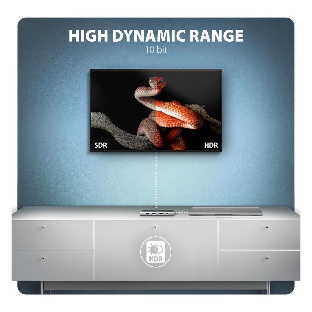 HDR-tuen (High Dynamic Range) ansiosta voit nauttia huomattavasti laajemmasta väri- ja kontrastivalikoimasta ilman rajoituksia. Jotta videolähdöt toimisivat kunnolla, kannettavassa tietokoneessa on oltava USB-C-portti, jossa on DisplayPort Alternate Mode (DP Alt Mode) -tuki, tai Thunderbolt 3 -portti, Thunderbolt 4 tai uudempi.