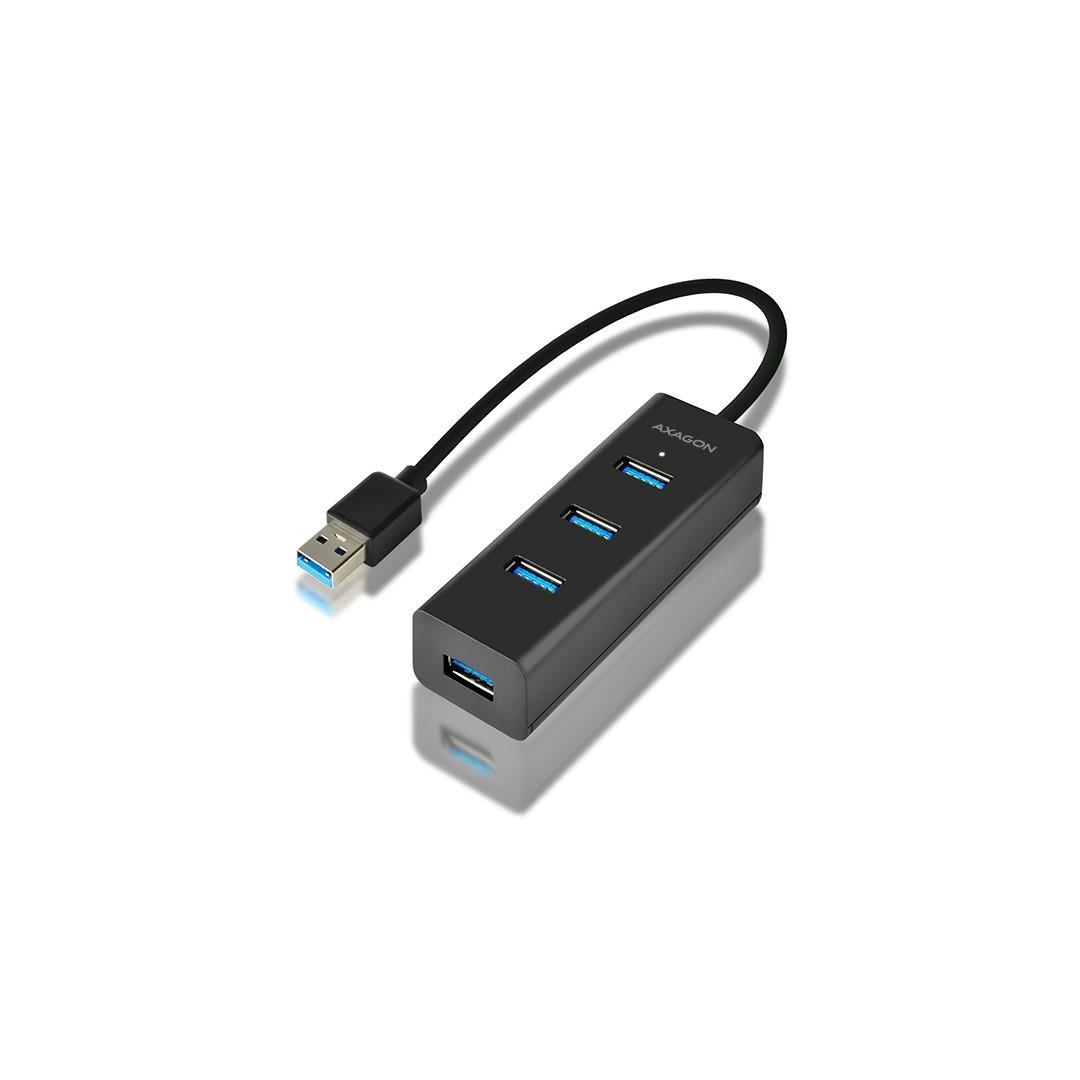 Neljäporttinen AXAGON HUE-S2B USB 3.0 -keskitin, jossa on lisävarusteena ulkoinen virta ja pikalataustuki kaikissa porteissa.