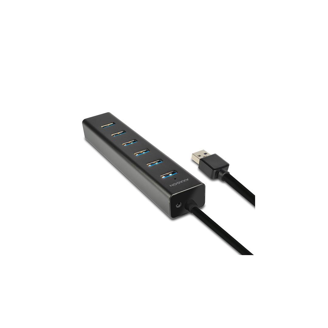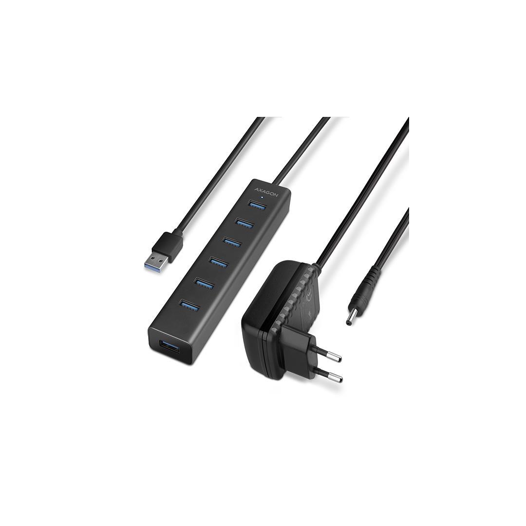 Seitsemänporttinen AXAGON HUE-SA7BP ALU CHARGING USB 3.0 -keskitin, jossa on oma virransyöttö ja pikalataustuki kaikissa USB-porteissa.