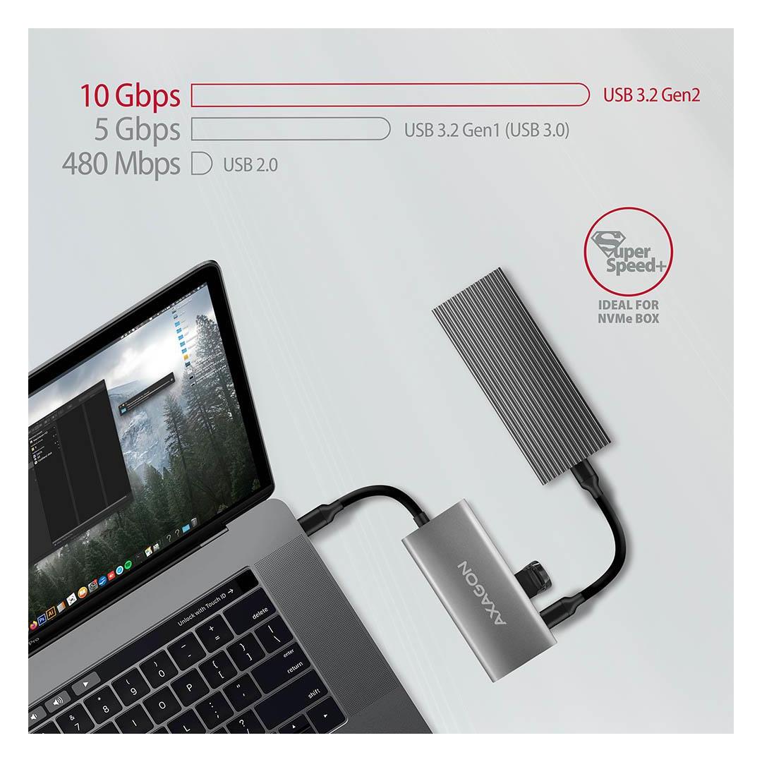 Edistyksellisen USB 3.2 Gen 2 -liitännän ansiosta voit liittää nopeat laitteet, kuten ulkoiset NVMe M.2 -asemat, kaikkiin ulostuloihin jopa 2 kertaa suuremmalla nopeudella 10 Gb/s verrattuna tavallisiin Generation 1 -hubeihin, joiden nopeus on vain 5 Gb/s. Keskitin pystyy käsittelemään useiden ulkoisten asemien pysyvää liittämistä samanaikaisesti, ja USB-C-portit mahdollistavat puhelinten ja tablettien lataamisen jopa 3 A:n virralla.