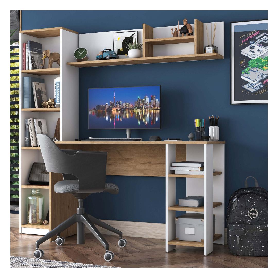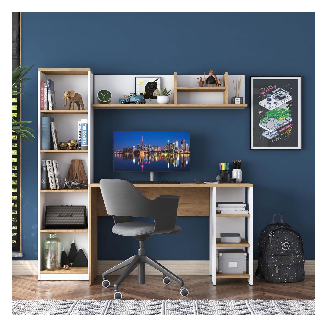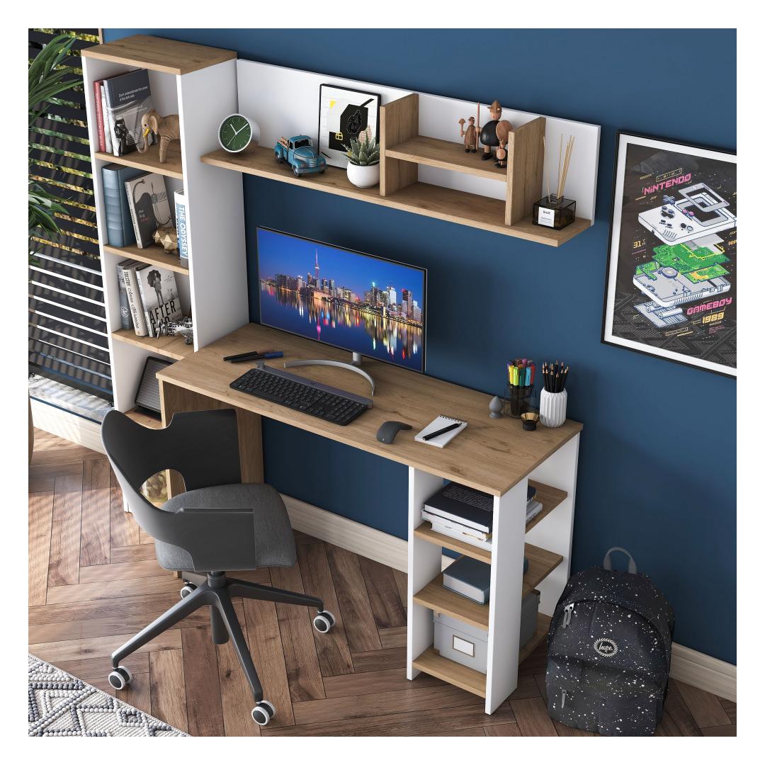 Muuda oma õpingute ruum produktiivsuse ja organiseerituse pelgupaigaks meie kauni õpingute laua abil. Valmistatud 100% melamiinkattega E1 kvaliteediga puitlaastplaadist, on see laud mitte ainult vastupidav, vaid ka kiirgab stiilset ja modernset esteetikat, mis tõstab esile iga ruumi.Hoia end organiseerituna ja inspireeritunaPaljude riiulite ja lisalao võimalustega saad hoida kõik oma õpingute tarvikud käeulatuses, võimaldades sul keskenduda ja olla inspireeritud kogu oma tööaja jooksul. Laua saab ka seina külge kinnitada, et tagada lisastabiilsus ja ohutus, muutes selle ideaalseks väikeste ruumide või lastega kodude jaoks.Mitmekülgne ja stiilneSelle laua mitmeotstarbeline disain teeb sellest ideaalse valiku üliõpilastele, professionaalidele või kõigile, kes vajavad pühendatud tööruumi. Pähklipuu ja valge värvikombinatsioon lisab igale ruumile elegantsi, samas kui avarad mõõtmed pakuvad piisavalt ruumi kõigi sinu õpingute materjalide jaoks.Tehnilised andmed:Materjal: 100% melamiinkattega E1 kvaliteediga puitlaastplaatMõõtmed: Laius 160 cm, Kõrgus 161,8 cm, Sügavus 45 cmVärv: Pähklipuu ja valgePalju riiuleid ladustamiseksLisalao võimalusedSaab kinnitada seina külge lisastabiilsuse tagamiseks Värv: Walnut White