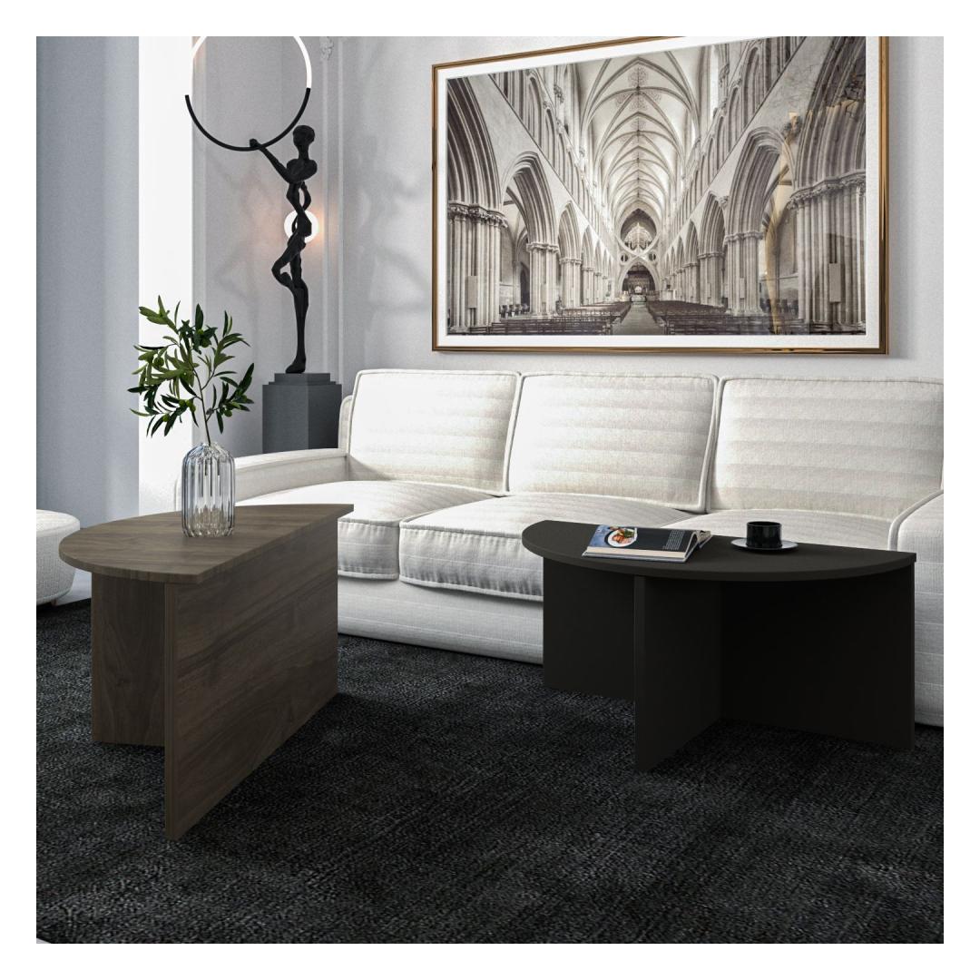 Esitleme meie hämmastavat ja mitmekesist kohvilaudade komplekti, mis on ideaalne, et lisada teie eluruumi elegantsi. See kaunilt valmistatud komplekt on loodud mitte ainult teie kodu esteetika parandamiseks, vaid pakub ka funktsionaalsust ja mugavust.Elegants ja funktsionaalsus koosSelle kohvilaudade komplekti voolujooneline disain kindlasti muljet avaldab teie külalistele ja tõstab teie elutoa üldilmet. Kontrastsed pähklipuu ja antratsiidi värvid lisavad igale sisustusele modernse puudutuse, muutes selle ideaalseks lisandiks igasse koju.Mugavus teie käeulatusesKuna see komplekt sisaldab kahte lauda, on teil paindlikkus kasutada neid koos komplektina või eraldi erinevates kodu piirkondades. Laudade erinevad kõrgused ja suurused võimaldavad lõputuid võimalusi stiilimiseks ja paigutamiseks.Kvaliteetne käsitööValmistatud 100% melamiinkattega puitlaastplaadist, on see kohvilaudade komplekt mitte ainult vastupidav ja pikaealine, vaid ka lihtne puhastada ja hooldada. 18 mm paksune plaat tagab stabiilsuse ja tugevuse, muutes selle usaldusväärseks mööbliesemeks aastateks.Tehnilised andmed:Materjal: 100% melamiinkattega puitlaastplaatPaksus: 18 mmEsimene laud: Laius: 70 cm, Kõrgus: 51,8 cm, Sügavus: 38 cmTeine laud: Laius: 70 cm, Kõrgus: 47,5 cm, Sügavus: 35 cmVärv: Pähklipuu ja antratsiit Värv: Walnut Anthracite