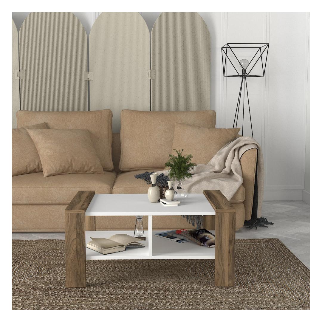 The combination of white and walnut colors in this coffee table creates a harmonious and visually appealing look that will instantly elevate the ambiance of any room. The sleek and modern design effortlessly complements any interior decor, making it a versatile addition to your living space.
