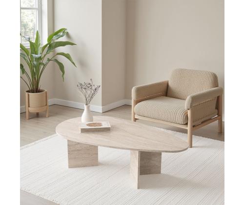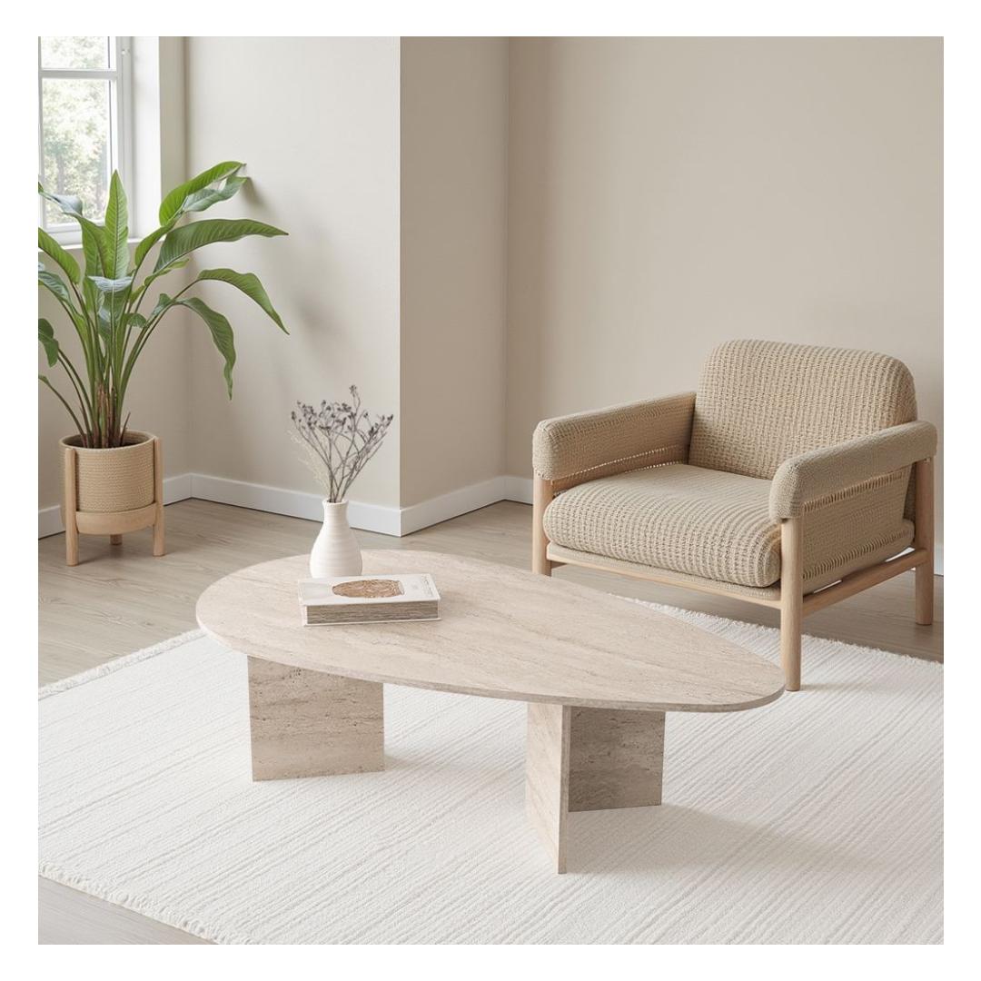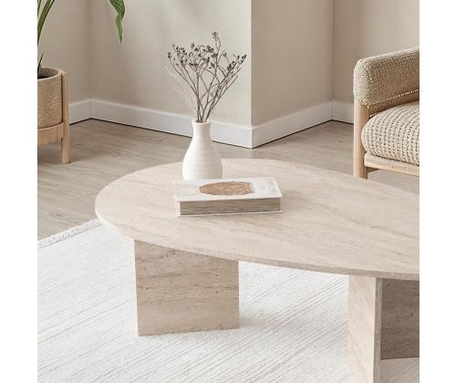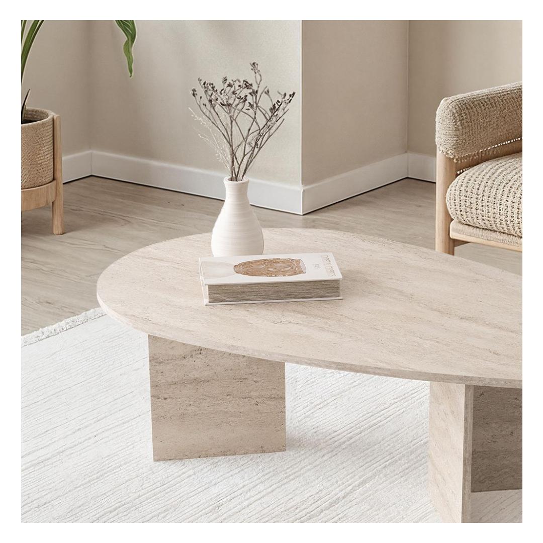Muuda oma eluruum meie kauni travertiinkohvilaudaga. See erakordne ese lisab igasse ruumi elegantsi ja rafineeritust, luues sooja ja kutsuva atmosfääri, millest saavad osa nii sina kui ka sinu külalised.Tõsta oma sisustus uuele tasemeleSee travertiini värviga kohvilaud on ajatu ja mitmekülgne, muutes selle ideaalseks lisandiks igasugusele sisustusele. Olgu sinu kodu modernne, traditsiooniline või midagi vahepealset, see kohvilaud sulandub sujuvalt keskkonda ja täiustab ruumi üldilmet.Kvaliteetne käsitööValmistatud 100% melamiinkattega puitlaastplaadist, on see kohvilaud mitte ainult ilus, vaid ka vastupidav ja pikaealine. 18 mm paksus tagab stabiilsuse ja tugevuse, samas kui puitlaastplaadi jalad pakuvad usaldusväärset tuge kõigile sinu kohvilauda kuuluvatele esemetel.Funktsionaalne ja stiilneLaia 139,5 cm, kõrguse 42 cm ja sügavuse 79,5 cm juures pakub see kohvilaud piisavalt pinda dekoratiivsete esemete väljapanekuks, ajakirjade hoidmiseks või lihtsalt jalgade üles tõstmiseks ja lõõgastumiseks. 100 kg kandevõime tähendab, et saad usaldada seda lauda oma asjade hoidmiseks kergelt.Tehnilised andmed:Materjal: 100% melamiinkattega puitlaastplaatPaksus: 18 mmJalad: PuitlaastplaatMõõtmed: 139,5 cm (L) x 42 cm (K) x 79,5 cm (S)Kandevõime: 100 kgVärv: Travertiin Värv: Travertine