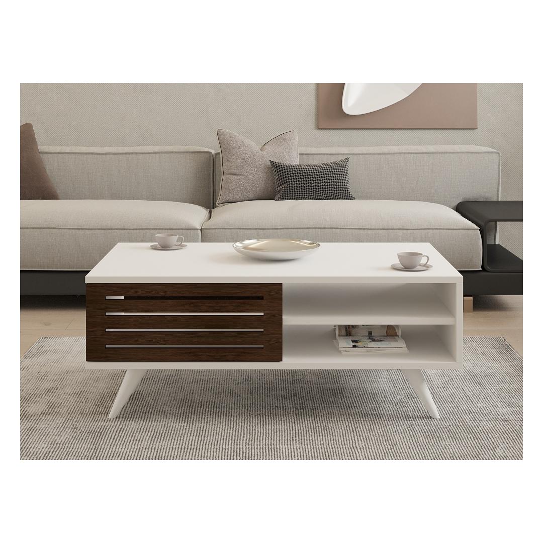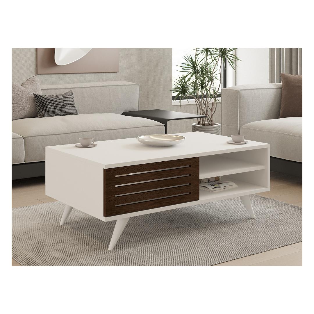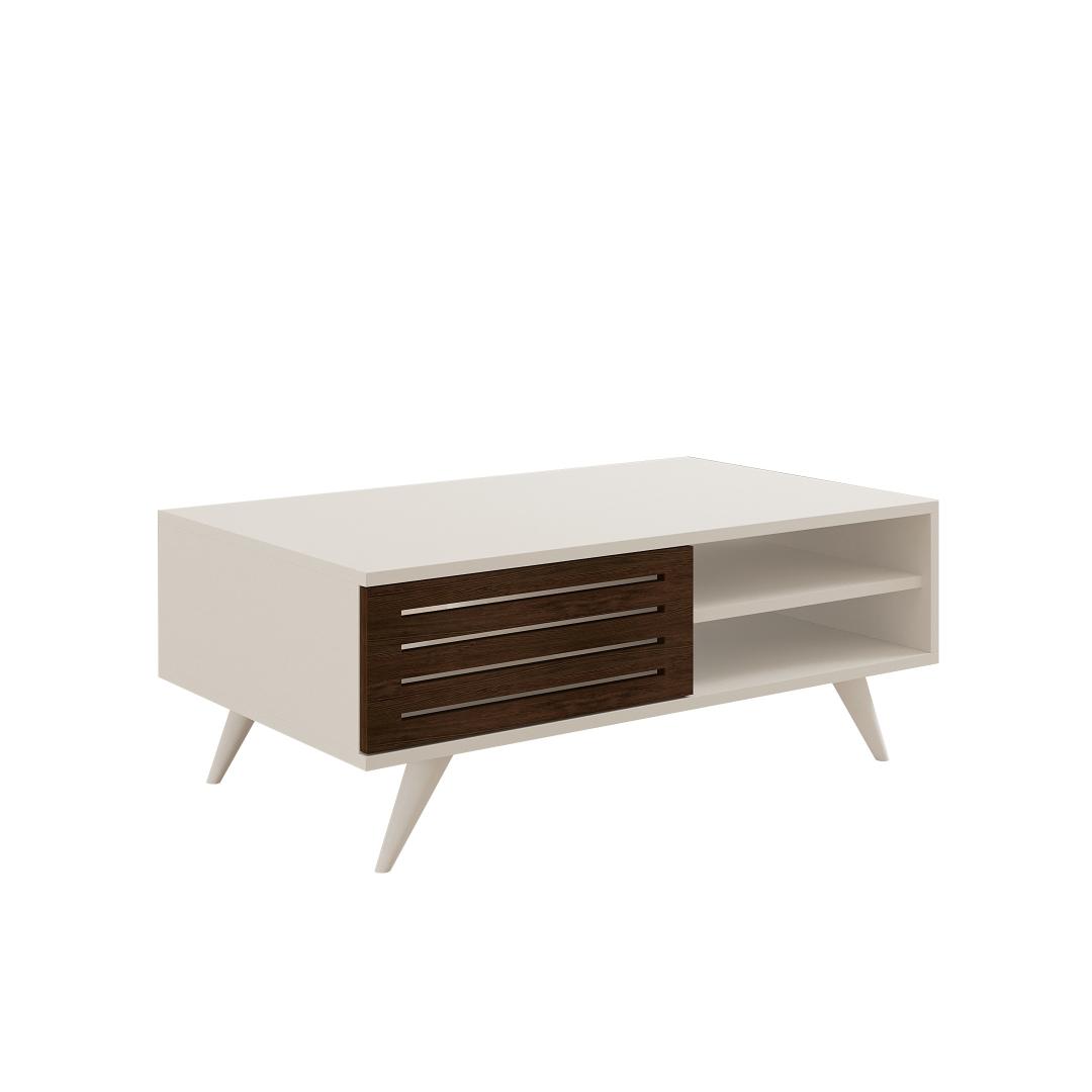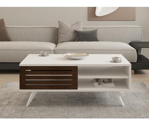 Crafted with utmost precision, this coffee table boasts a solid wood door and a 30mm thick, 100% melamine coated particle board construction. The exquisite combination of walnut and white colors adds a touch of sophistication to any room, effortlessly blending with any existing decor.