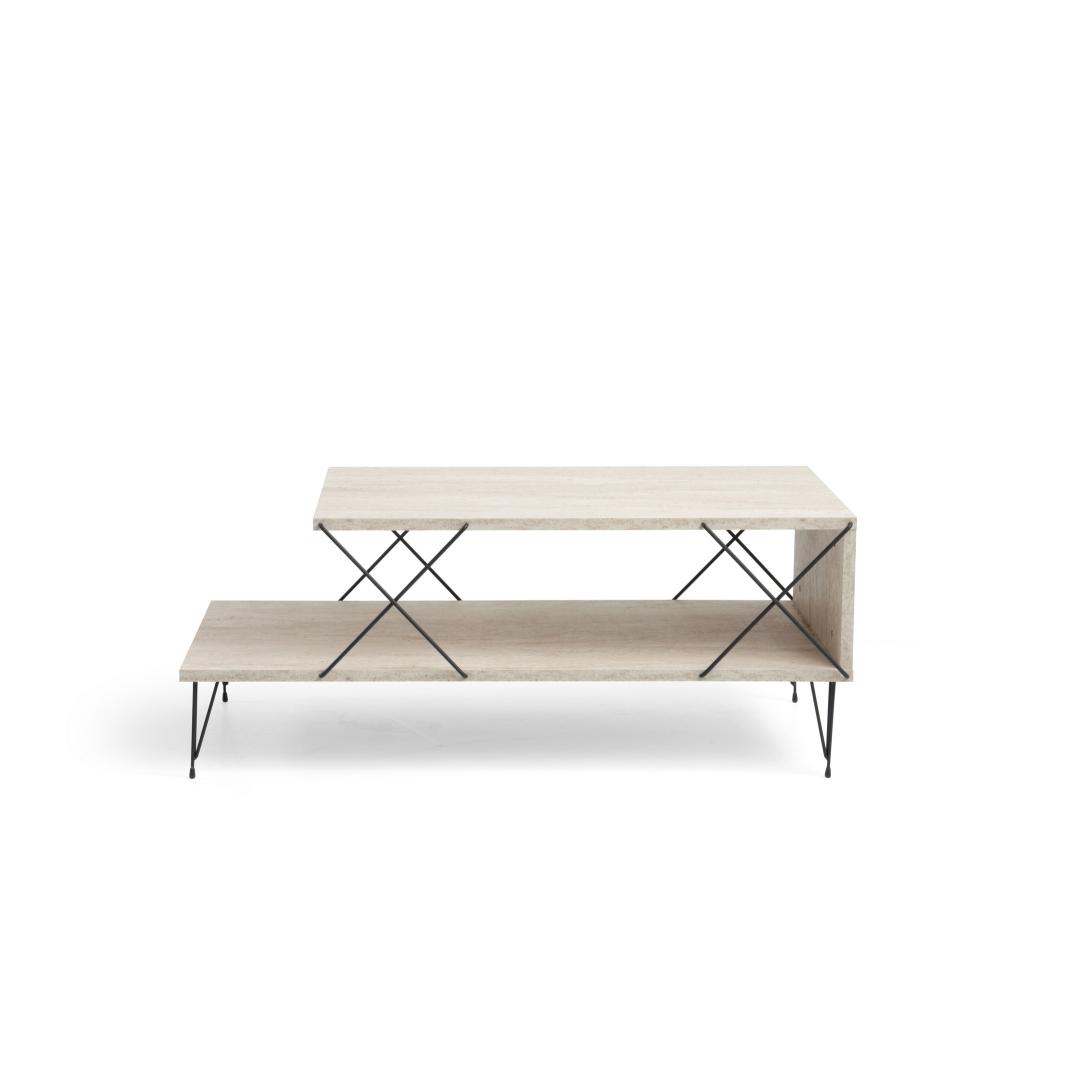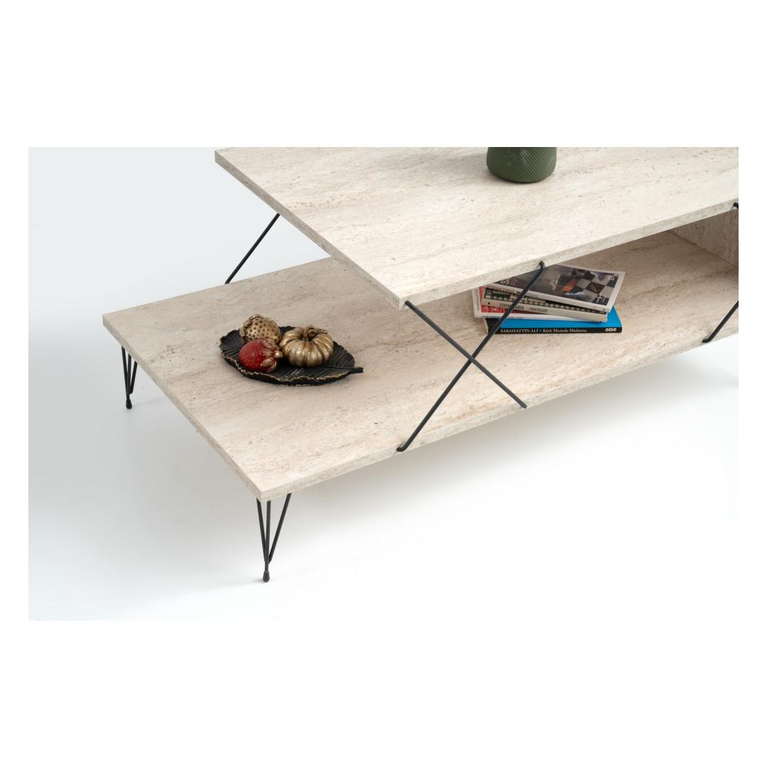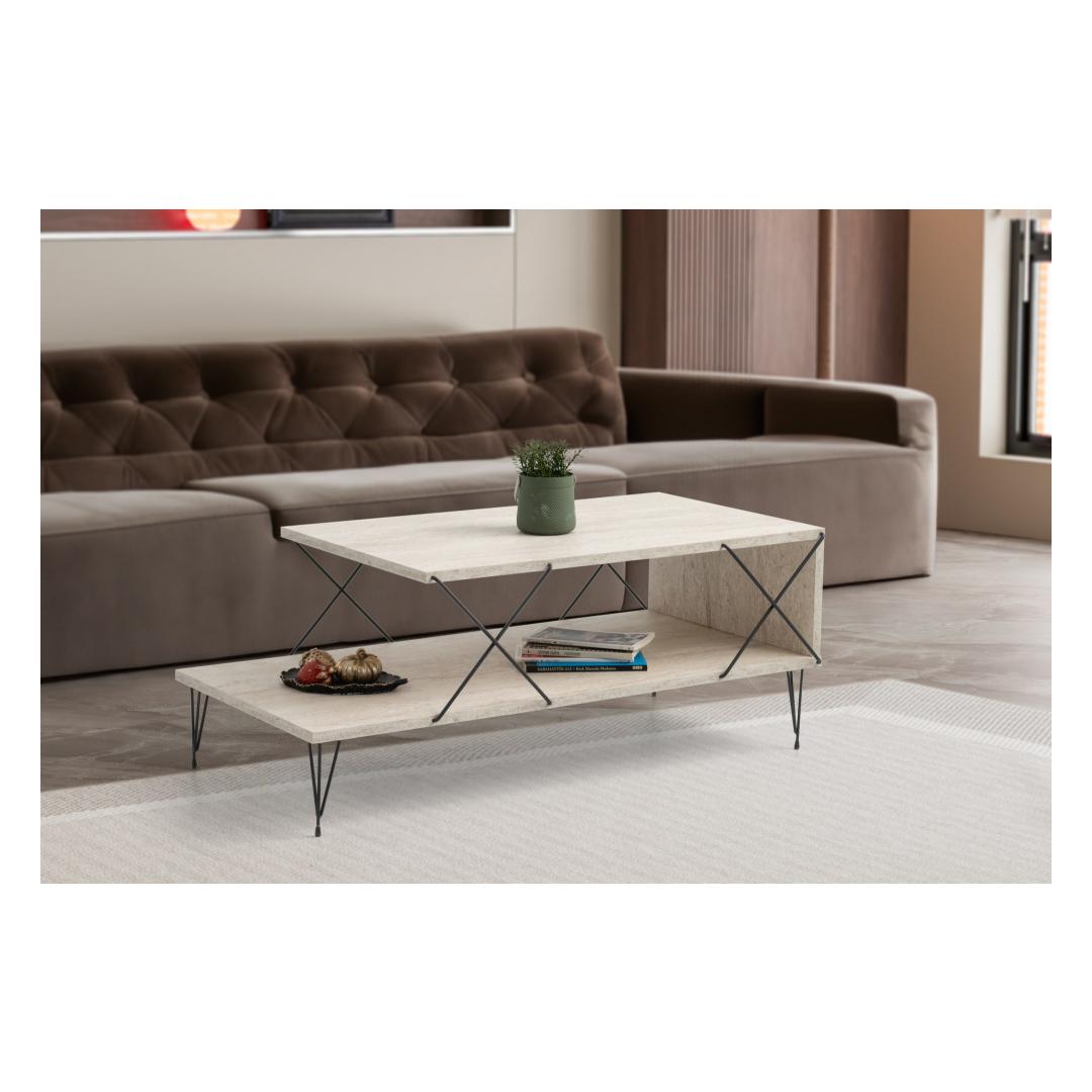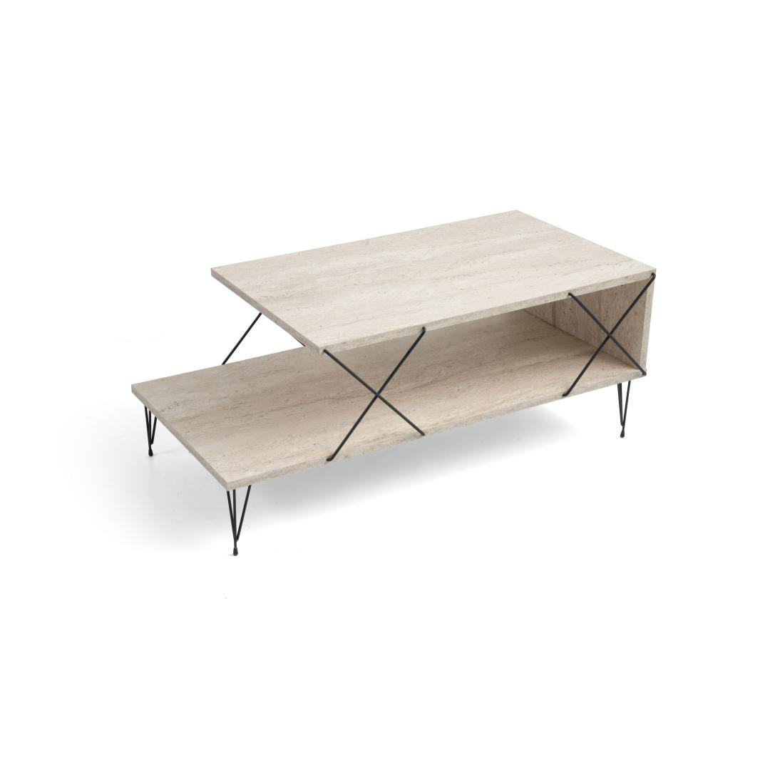Transform your living space with our stunning Marble Coffee Table. This exquisite piece is crafted from 100% melamine coated particle board, ensuring durability and longevity. The sleek metal legs add a modern touch, while the travertine and black color combination exudes elegance and sophistication.