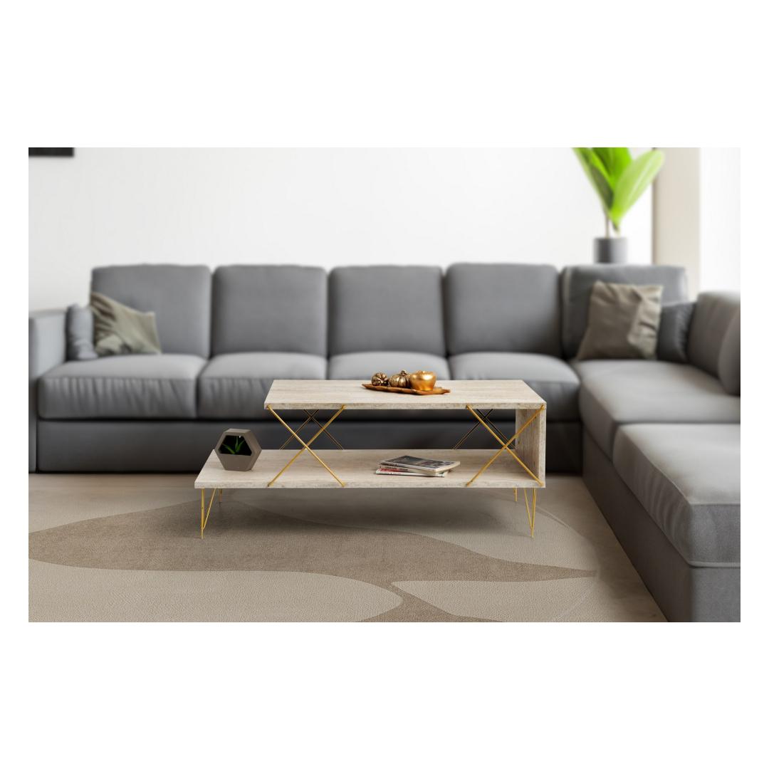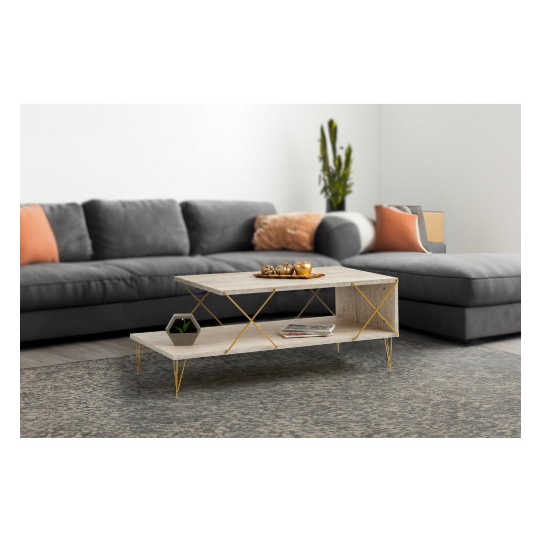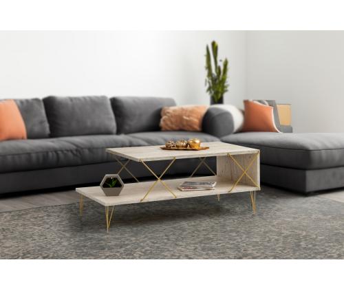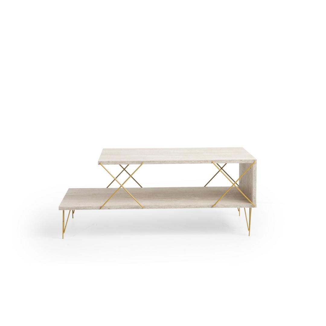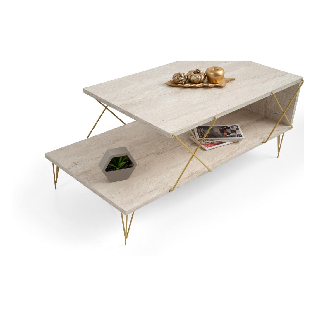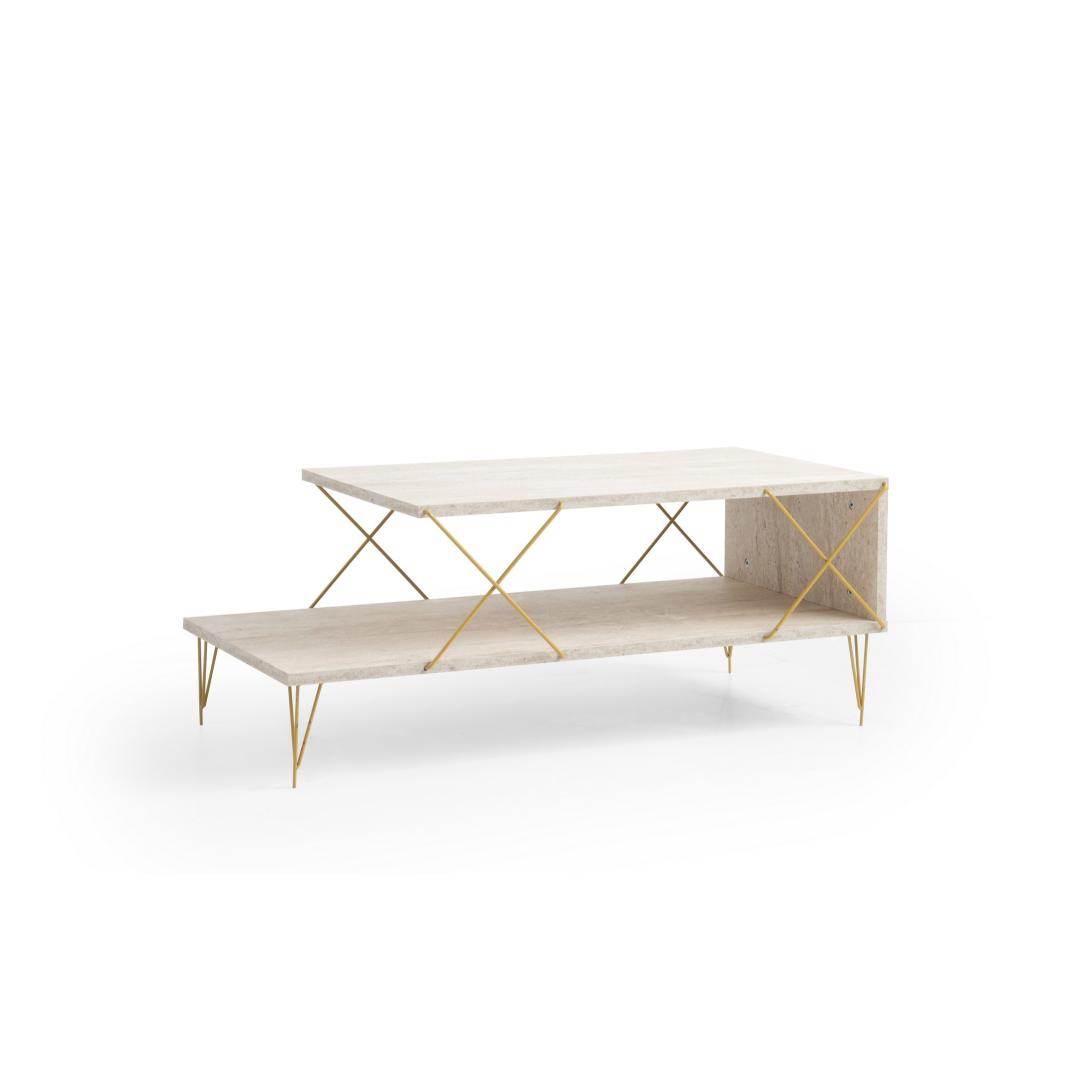 Transform your living room into a luxurious and elegant space with our stunning Marble Coffee Table. Crafted from 100% melamine coated particle board, this coffee table exudes sophistication and style. The sleek metal legs add a modern touch, while the travertine and gold colors create a timeless look that will elevate any room.