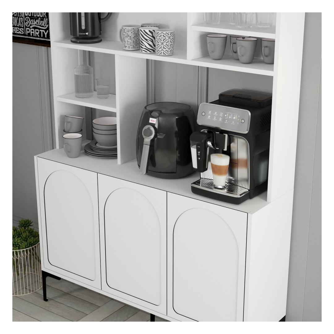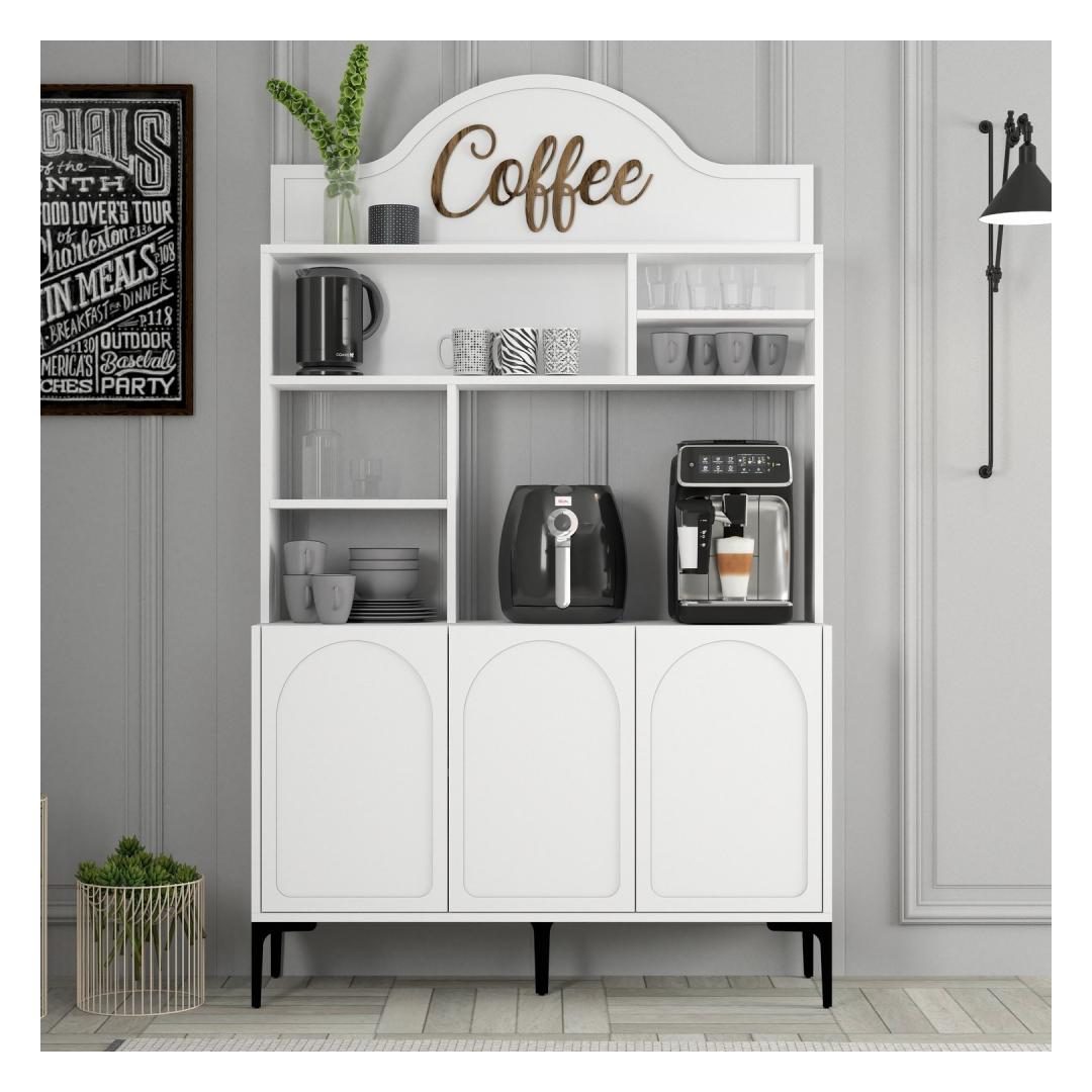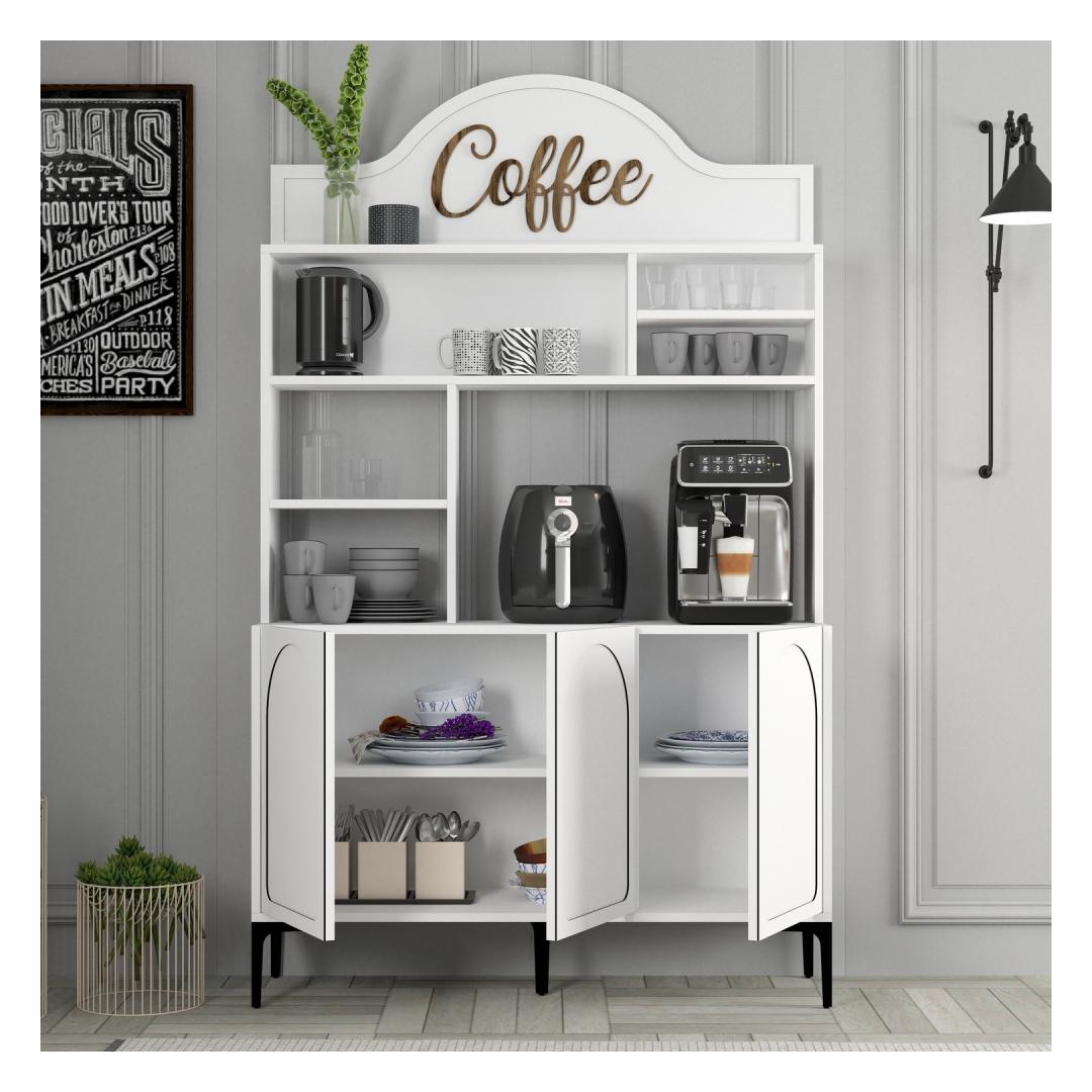 The combination of white and black colors gives this coffee bar cabinet a contemporary look that will seamlessly blend with any decor style. The numerous shelves allow you to display your coffee collection in an organized and visually appealing manner, making it a focal point in your kitchen or dining area.