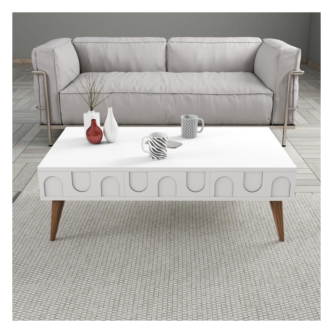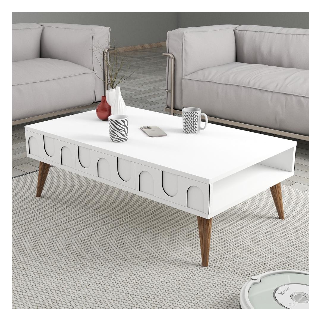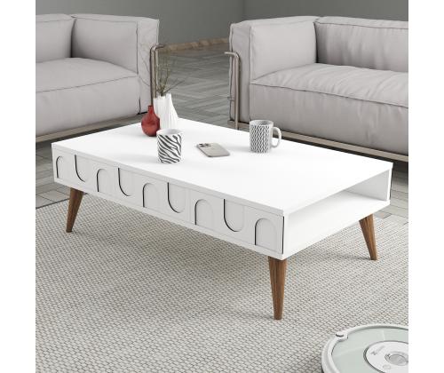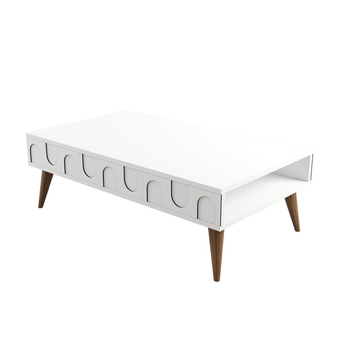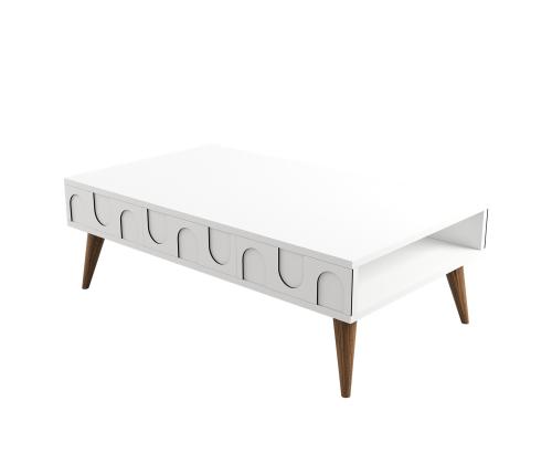 Elevate your living space with our stunning coffee table, crafted from 100% melamine coated particle board for durability and style. The sleek design features a perfect blend of white and walnut colors, adding a touch of elegance to any room.