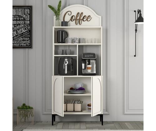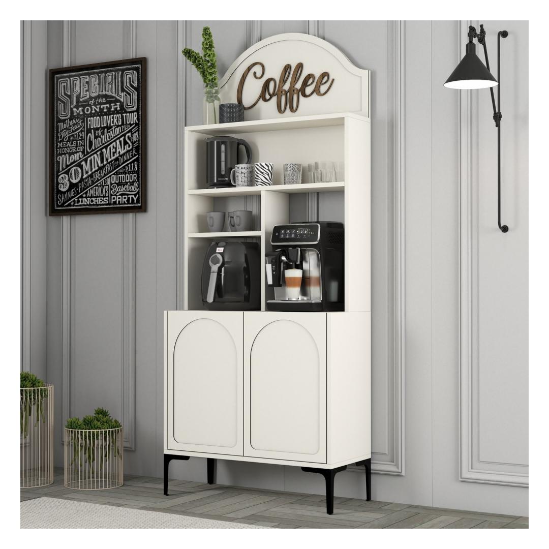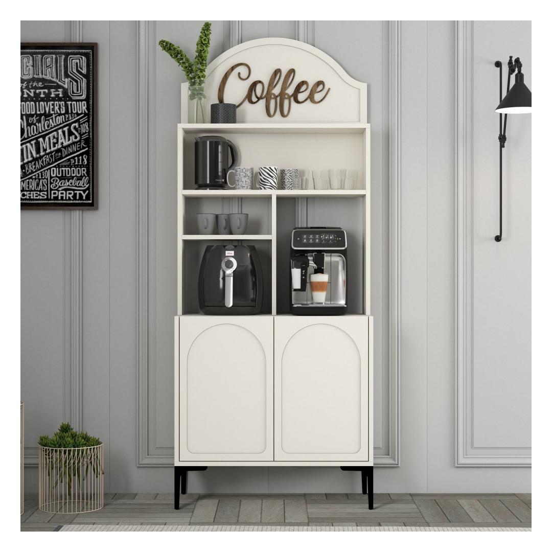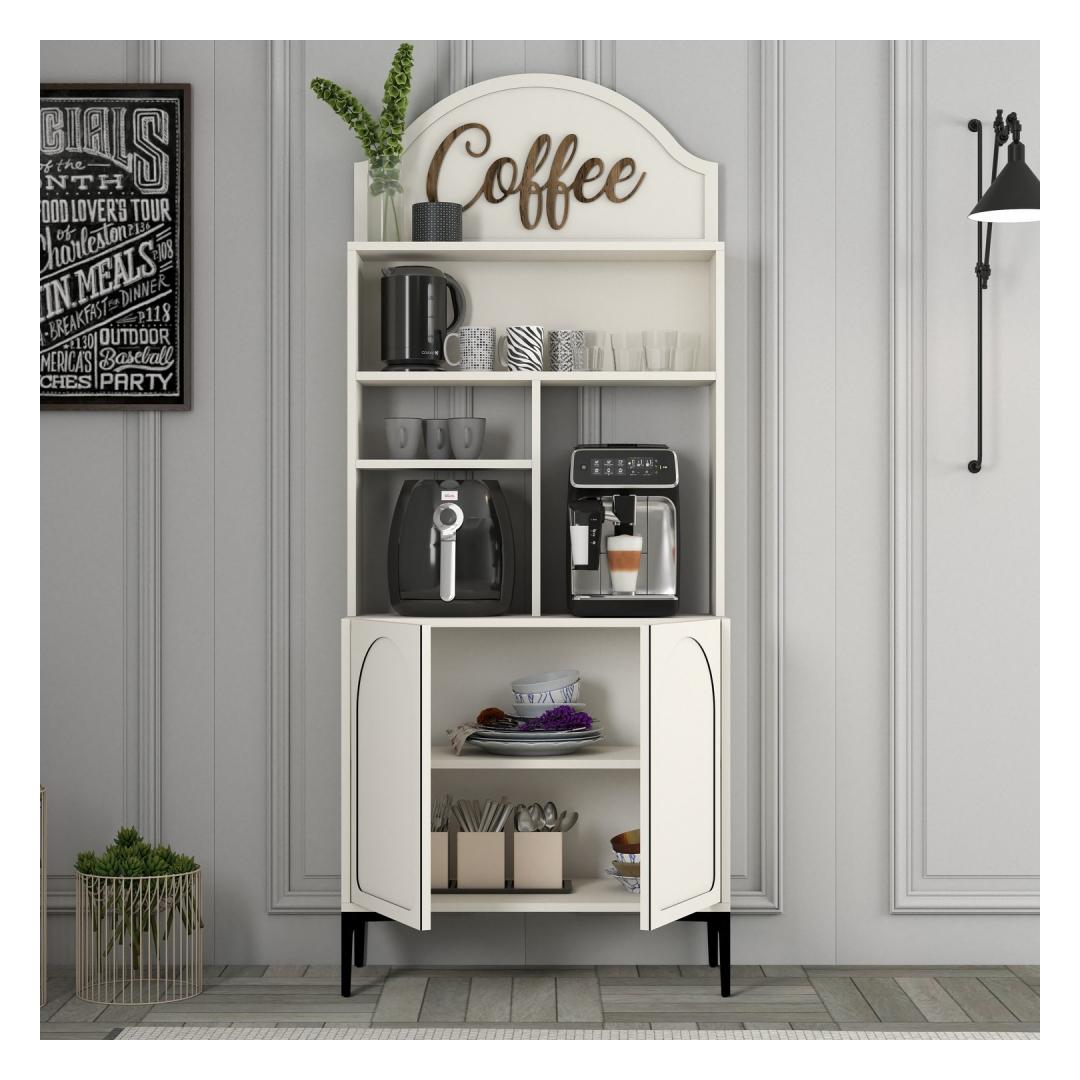 Crafted from 100% melamine coated particle board, this cabinet is built to last. The 18mm thickness ensures sturdiness and durability, while the numerous shelves provide ample storage space for all your coffee essentials. The cream and black color combination adds a touch of sophistication to the piece, making it a stylish addition to any room.