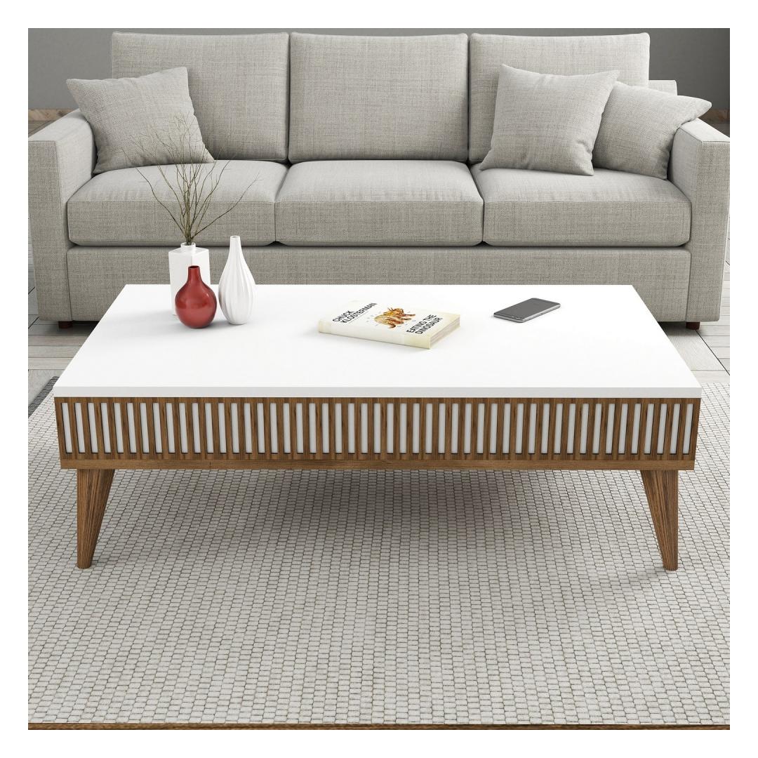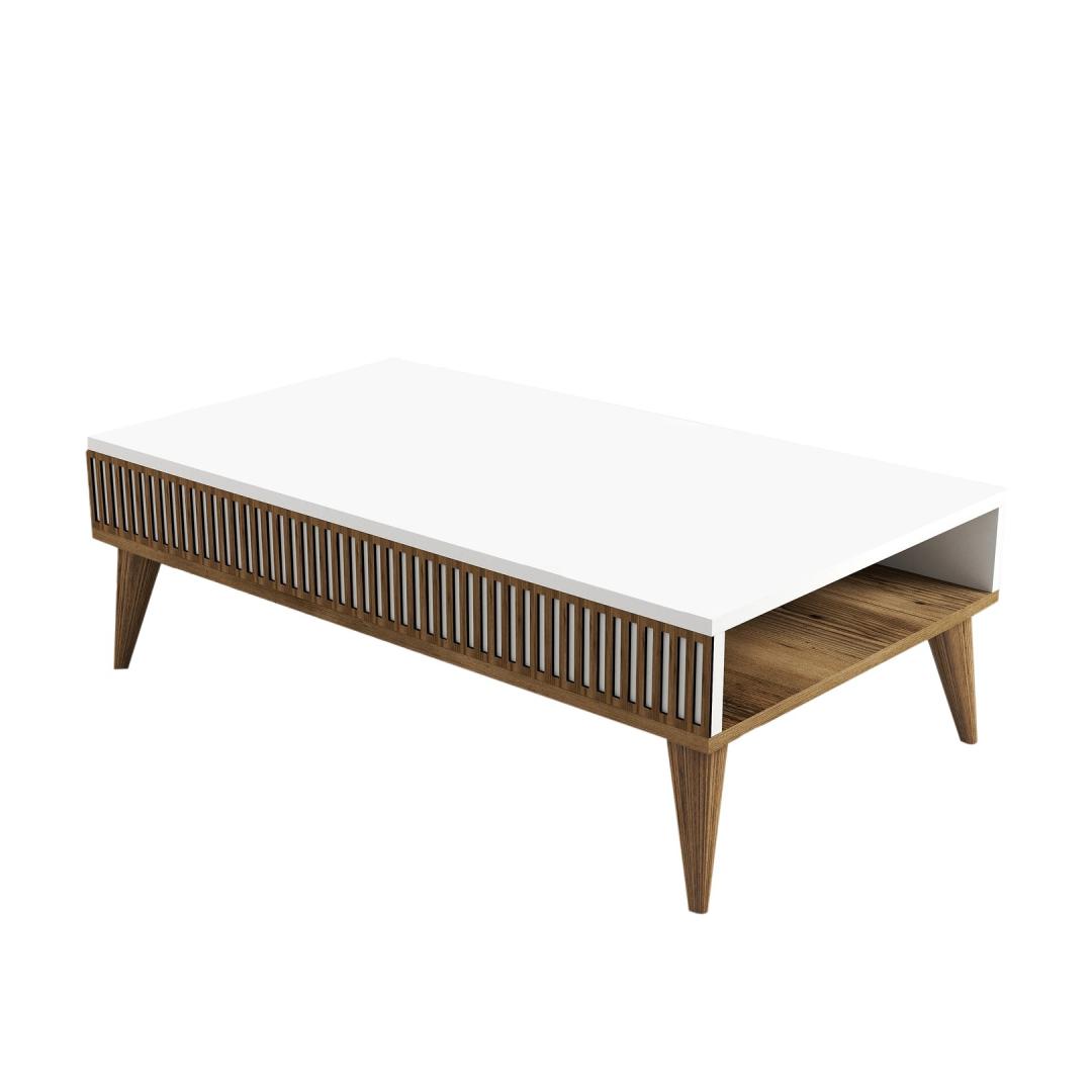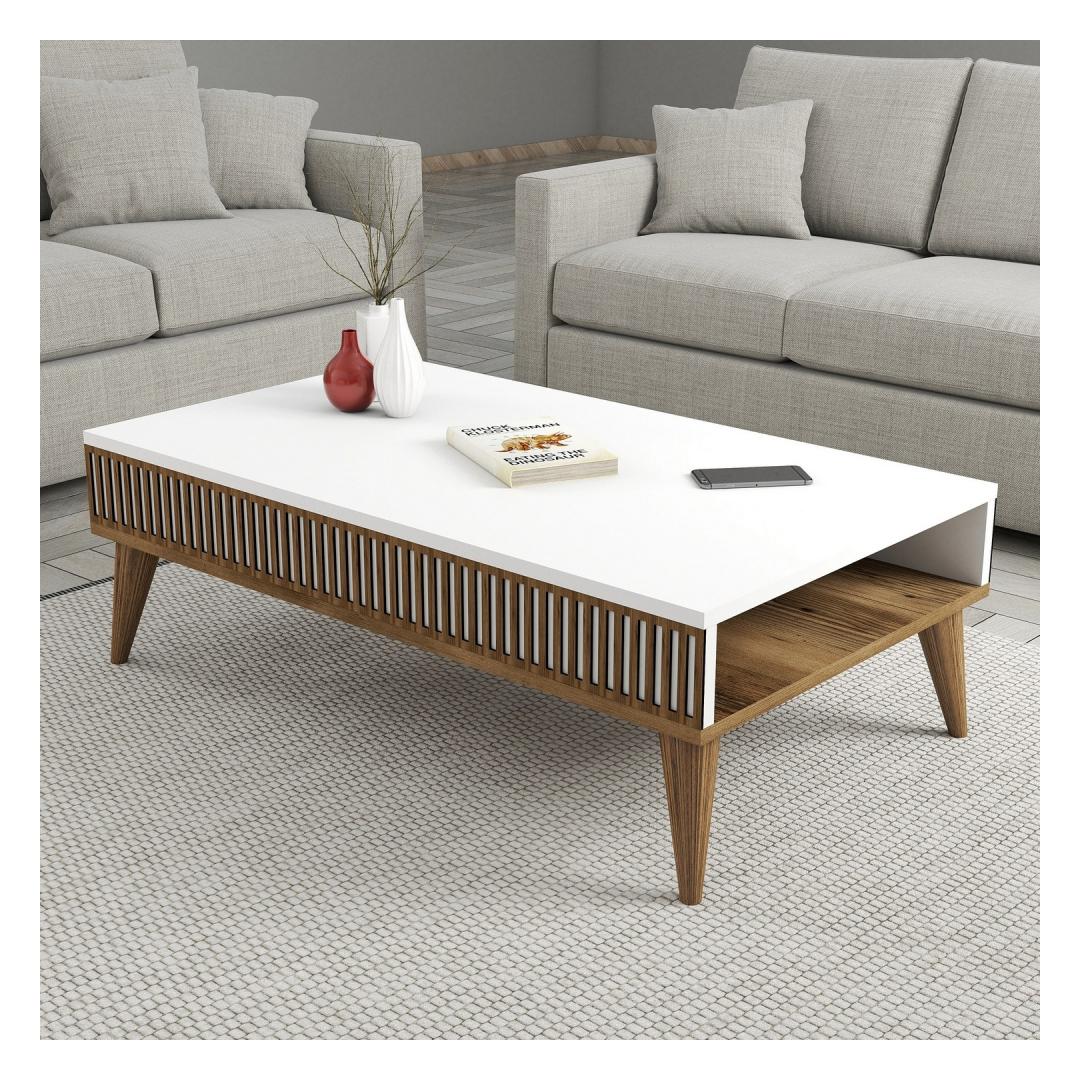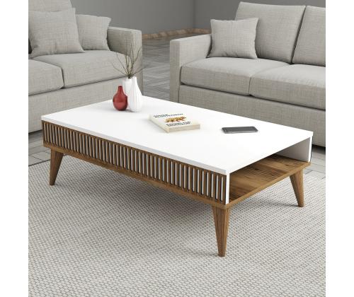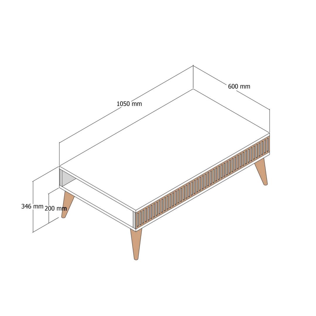 With a width of 105cm, height of 34.6cm, and depth of 60cm, this coffee table offers ample space to display your favorite decor items or to serve as a convenient surface for your morning coffee. The combination of walnut and white colors adds a touch of sophistication and versatility, effortlessly blending with any interior style.