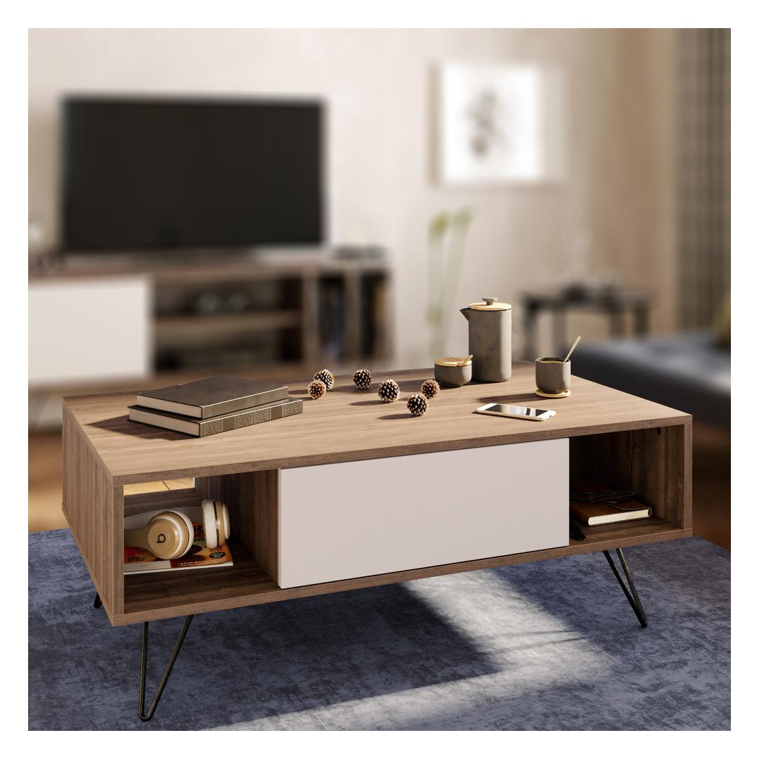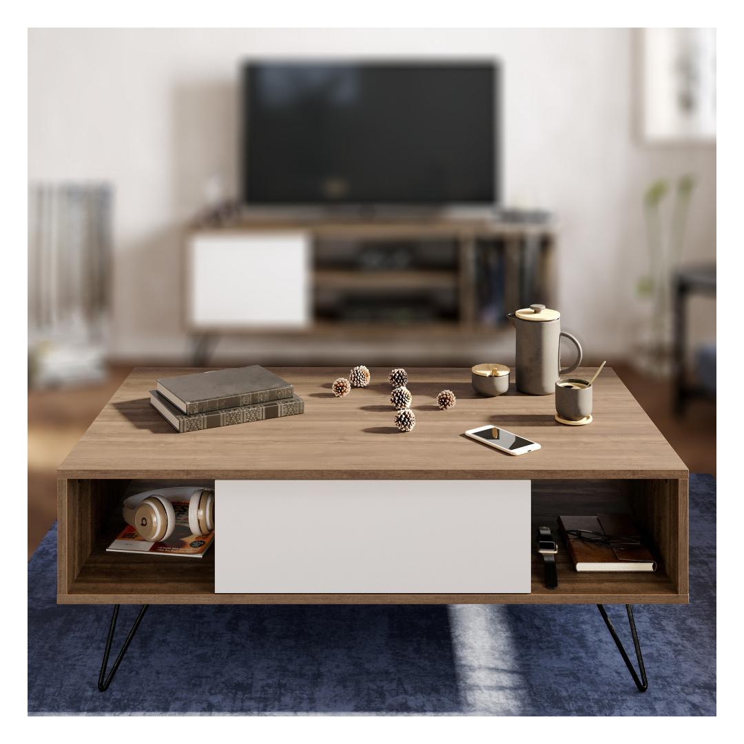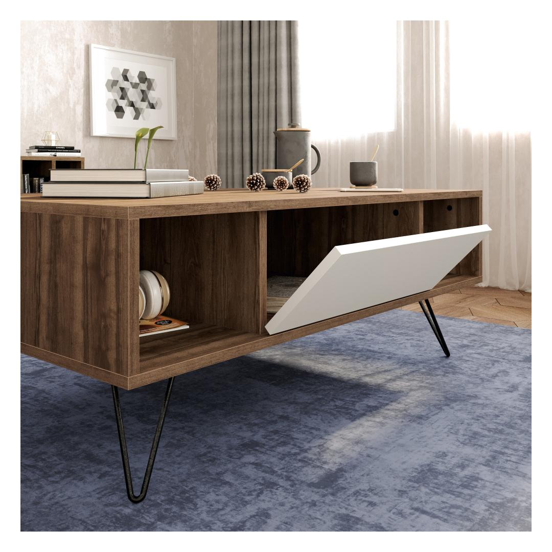 With its modern and innovative design, this coffee table is a true masterpiece that will captivate your guests and leave them in awe. Crafted with utmost precision, it boasts a flawless combination of walnut and white colors, creating a striking visual appeal that complements any interior decor.