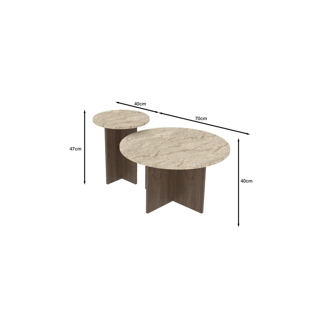 Muuda oma eluruum meie kauni kohvilaudade komplektiga. Valmistatud 100% melamiinkattega puitlaastplaadist, on see komplekt mitte ainult vastupidav, vaid ka äärmiselt stiilne. Travertiinist ja pähklipuidust värvide kombinatsioon lisab igasse ruumi elegantsi, muutes selle ideaalseks lisandiks sinu koju.Tõsta oma elutubaÜtle hüvasti igavale ja vananenud mööblile. Meie kohvilaudade komplekt on loodud selleks, et tõsta sinu elutuba ja luua soe ning kutsuv atmosfäär sinu ja sinu külaliste jaoks. Sujuv ja modernne disain tõstab koheselt sinu ruumi välimust, muutes selle igas toas keskpunktiks.Kvaliteetne käsitööIga selle komplekti tükk on hoolikalt valmistatud detailidele tähelepanu pöörates. Kvaliteetne melamiinkattega puitlaastplaat tagab pikaajalise vastupidavuse, nii et saad nautida oma uut kohvilaudade komplekti aastaid. Lahtivõetav disain muudab selle lihtsaks kokku panna ja ringi liigutada, andes sulle paindlikkuse oma ruumi igal ajal ümber korraldada.Tehnilised andmed:Materjal: 100% melamiinkattega puitlaastplaatVärv: Travertiin ja pähkelSuur laud: Laius 70 cm, Kõrgus 40 cm, Sügavus 70 cmVäike laud: Laius 40 cm, Kõrgus 47 cm, Sügavus 40 cmLahtivõetav lihtsaks kokkupanekuks ja transportimiseksÄra jäta kasutamata võimalust muuta oma eluruum meie kohvilaudade komplektiga. Lisa see stiilne ja funktsionaalne ese oma koju juba täna ja koge, millist erinevust see su igapäevaelus võib teha. Värv: Travertine Walnut