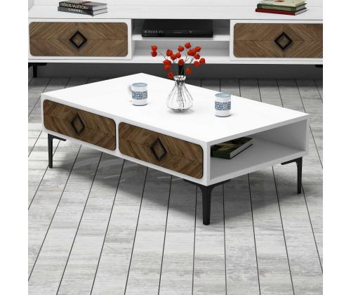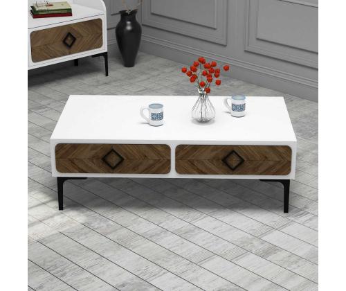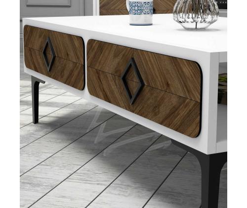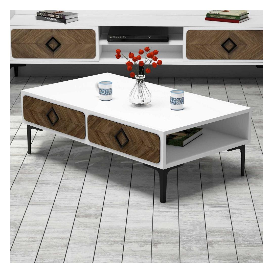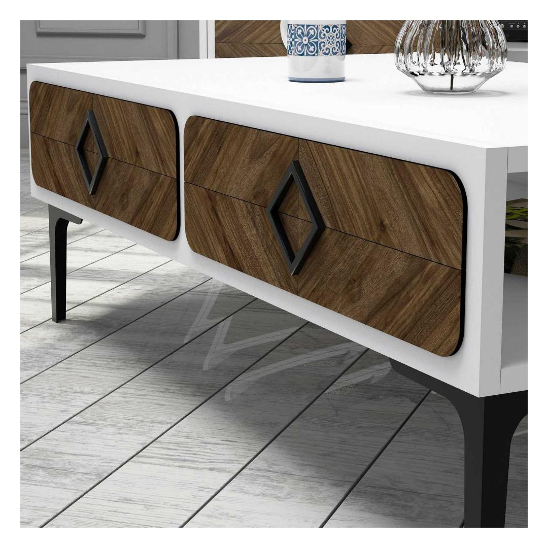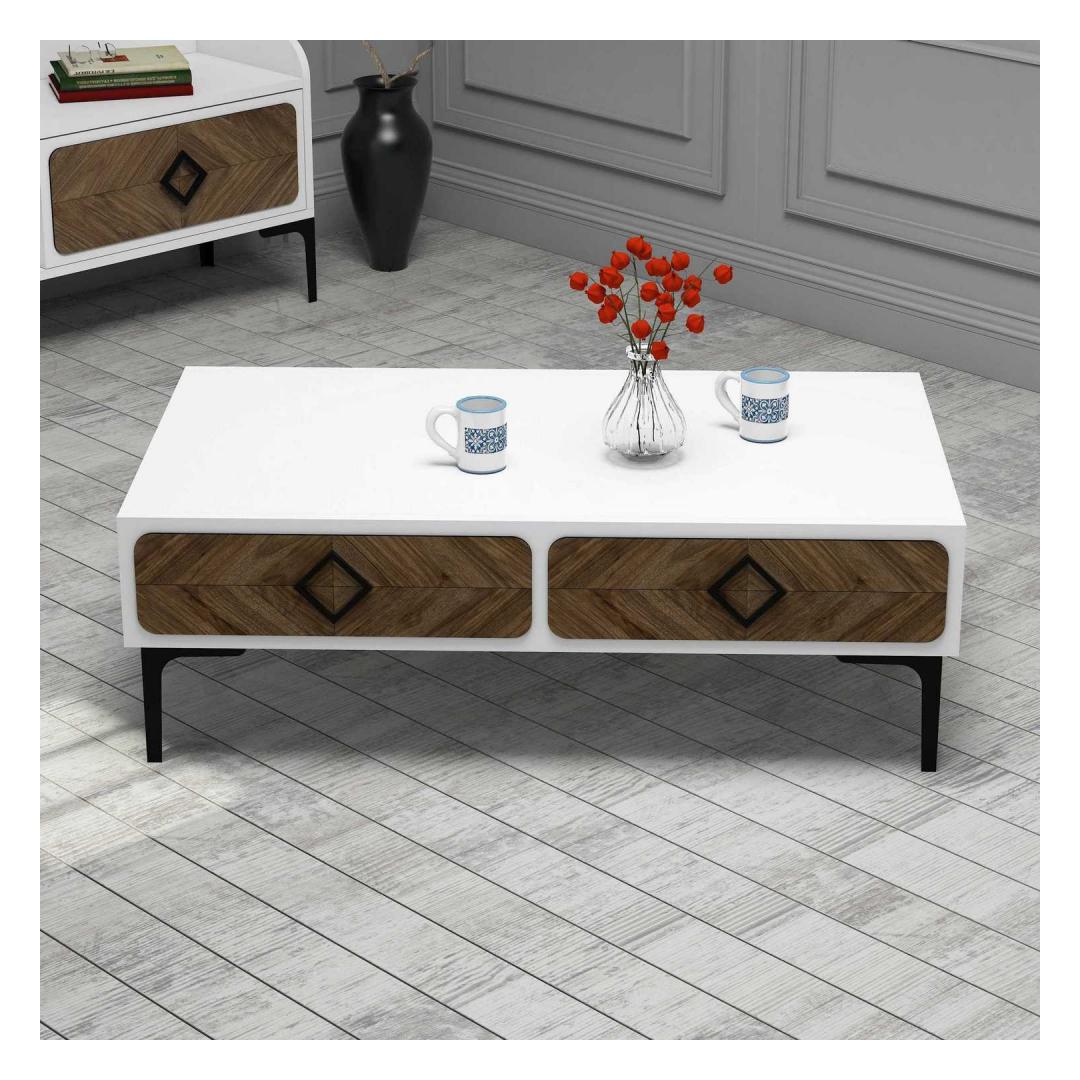 The coffee table boasts a harmonious blend of white and walnut colors, creating a visually striking contrast that adds a touch of sophistication to any room. The combination of these two timeless shades effortlessly complements any existing decor, making it a versatile addition to your home.