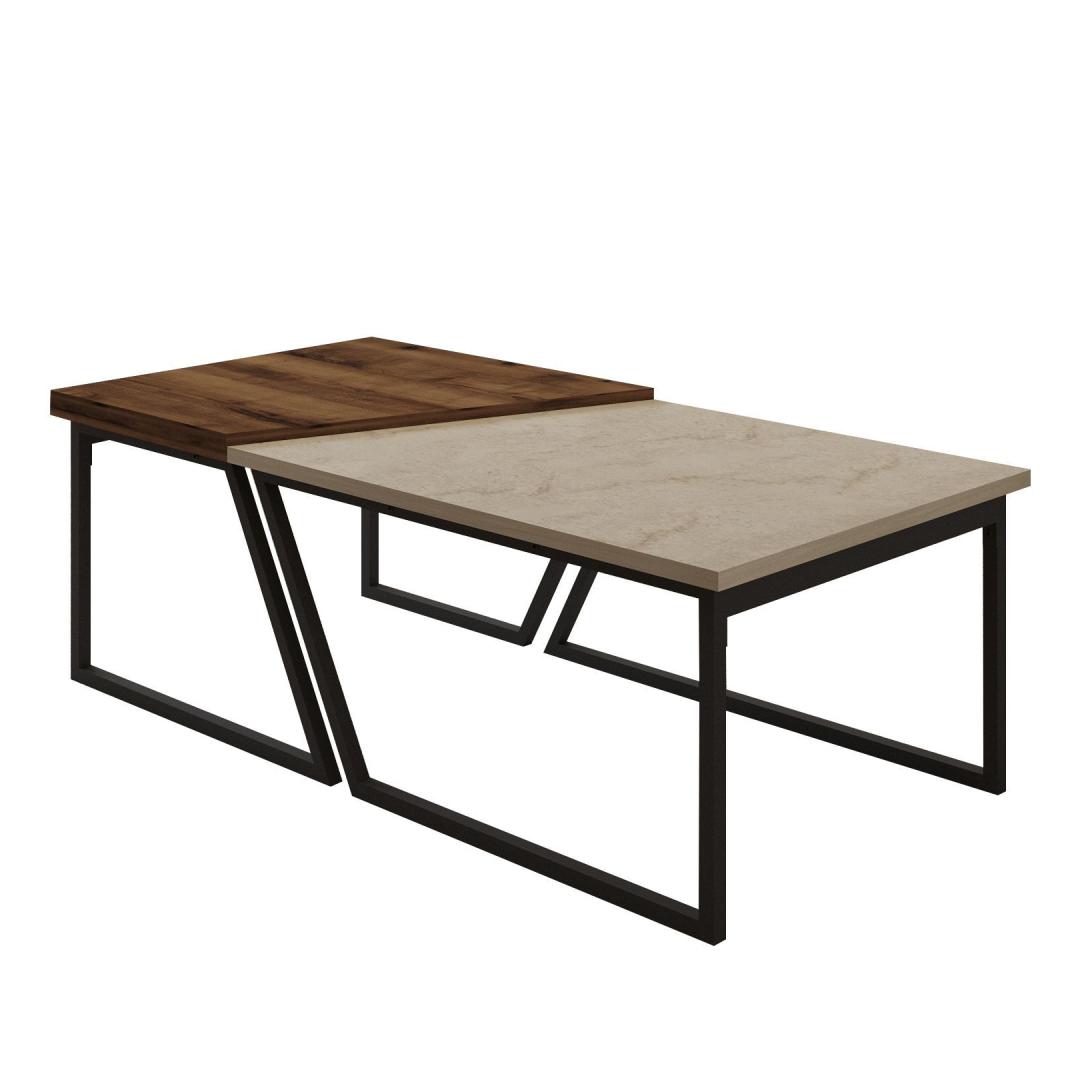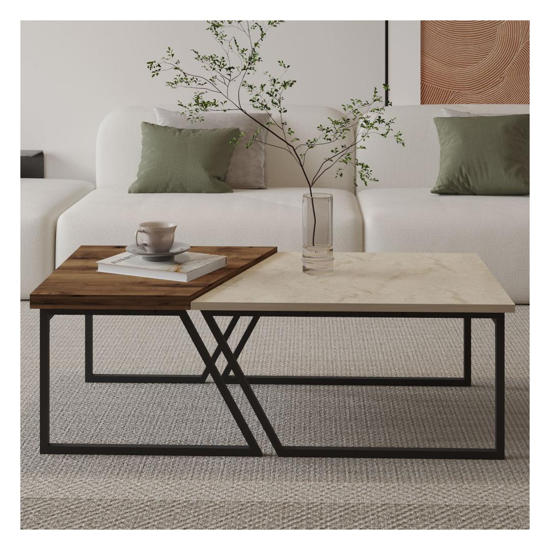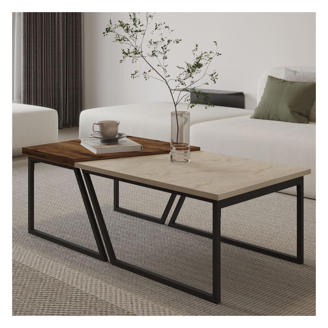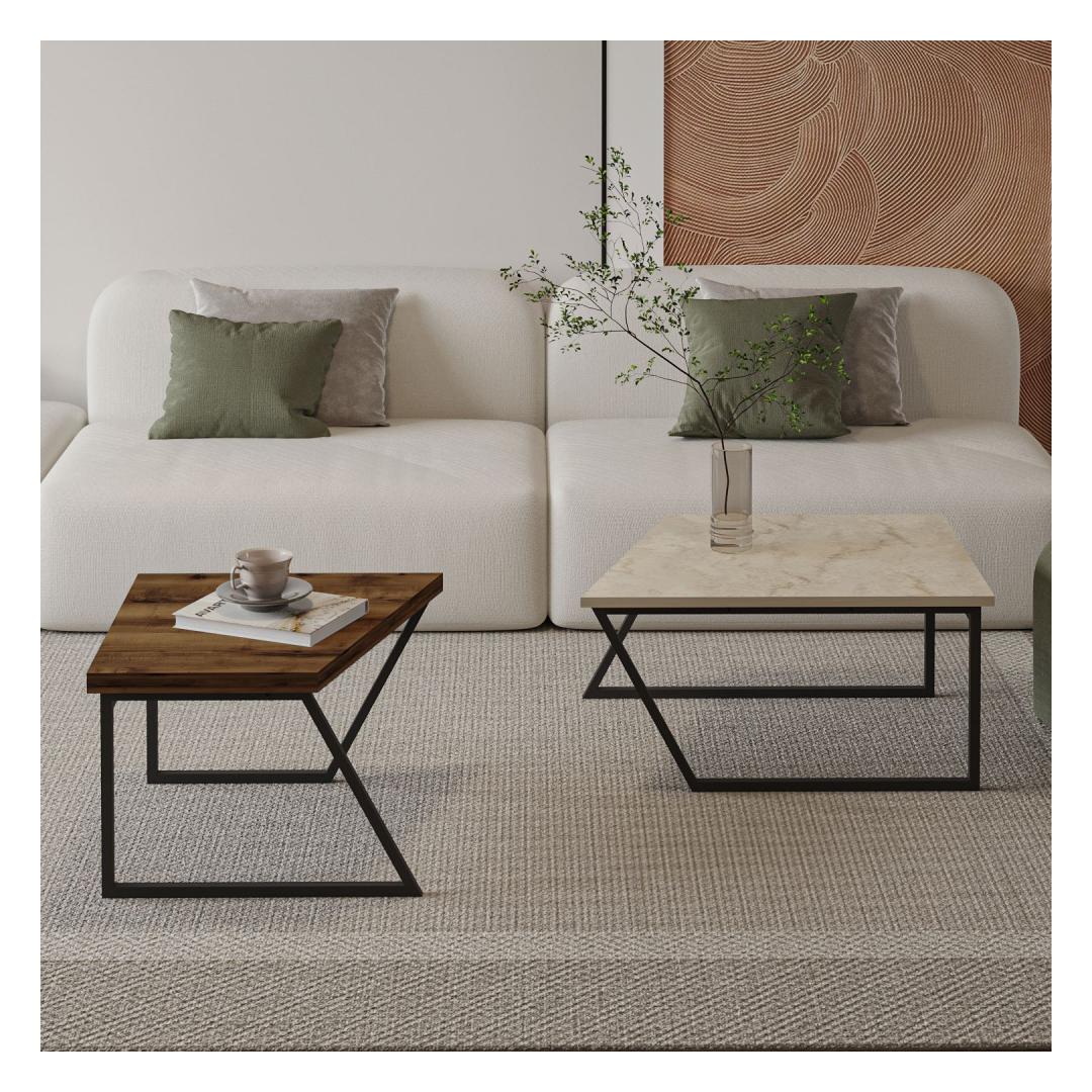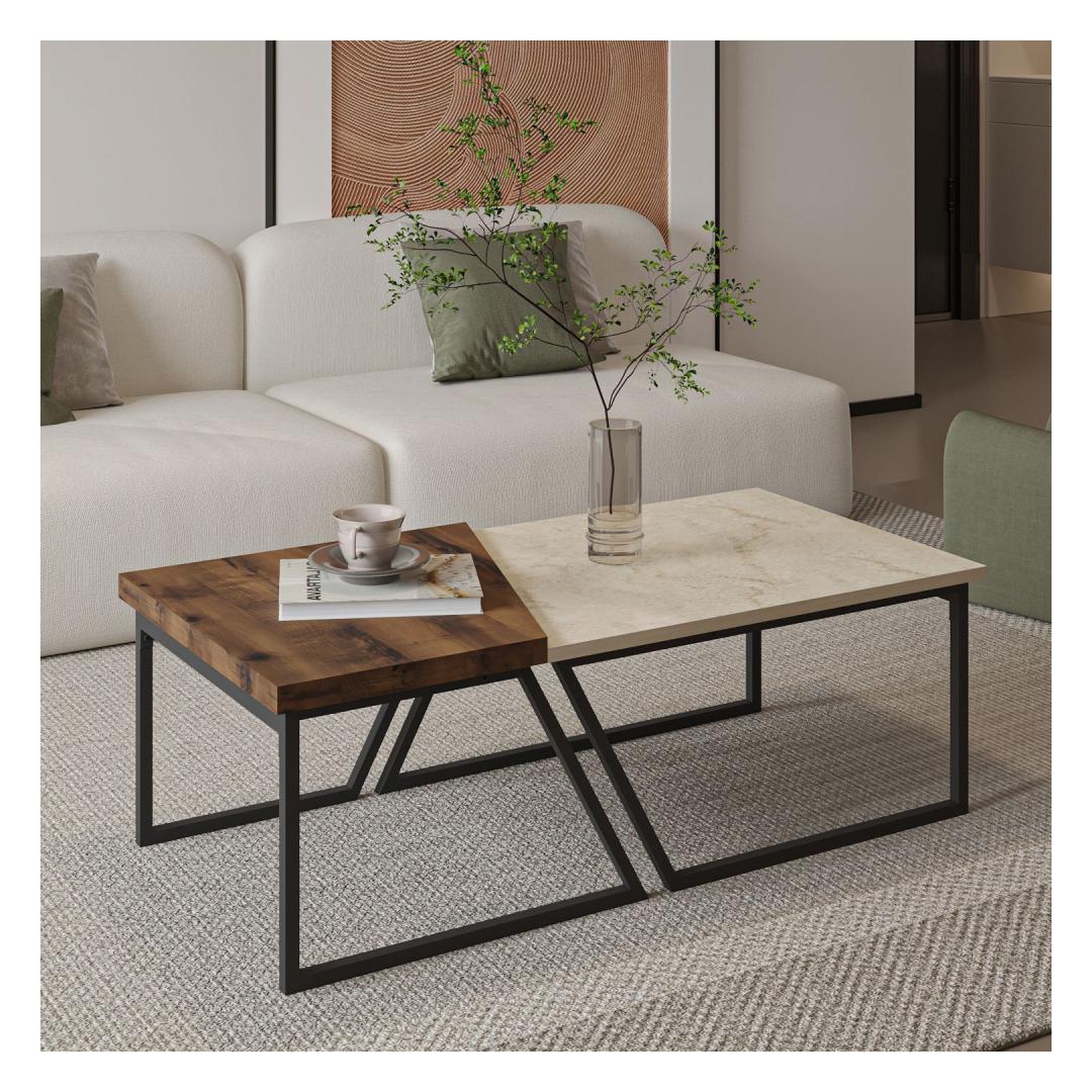 Muuda oma eluruum meie kauni kohvilaudade komplektiga. Valmistatud 100% melamiinkattega puitlaastplaadist, on see komplekt mitte ainult vastupidav, vaid ka äärmiselt stiilne. Travertiinist ja rustikaalsest pähklipuidust värvide kombinatsioon lisab igasse ruumi elegantsi, samas kui mustad metalljalad annavad sellele modernse pöörde.Tõsta oma ruumiSee kohvilaudade komplekt on loodud selleks, et tõsta sinu ruumi ja luua hubane atmosfäär, kus sina ja sinu lähedased saaksite nautida. Suur laud on ideaalne külaliste meelelahutamiseks või lemmik dekoratiivesemete väljapanekuks, samas kui väike laud sobib suurepäraselt hommikukohvi või hea raamatu hoidmiseks.Kvaliteetne käsitöö18mm paksune puitlaastplaat tagab, et need lauad on ehitatud kestma, samas kui iga detaili täpsed mõõdud loovad ruumis harmoonilise tasakaalu. Kokku 120 cm laiune pind pakub piisavalt ruumi kõigeks, olgu selleks peremänguõhtu või vaikne õhtu kodus.Tehnilised andmed:Materjal: 100% melamiinkattega puitlaastplaatPaksus: 18mmSuur laud: Laius: 60-80cm, Kõrgus: 38.8cm, Sügavus: 60cmVäike laud: Laius: 40-60cm, Kõrgus: 40.6cm, Sügavus: 60cmKokku suurus: Laius: 120cm, Kõrgus: 40.6cm, Sügavus: 60cmJalad: Mustad metalljaladVärv: Travertiin ja rustikaalne pähkel Värv: Travertine Rustic Walnut