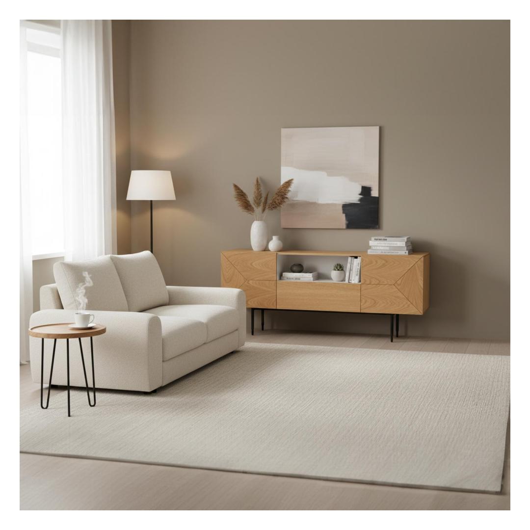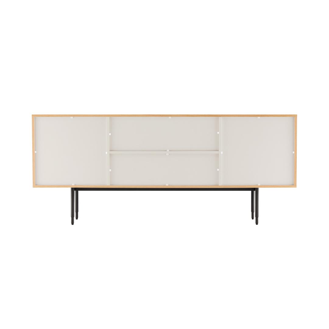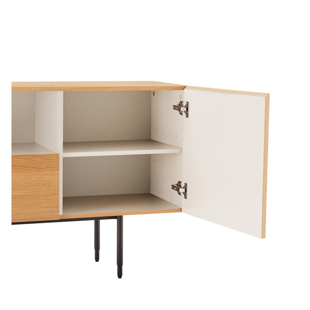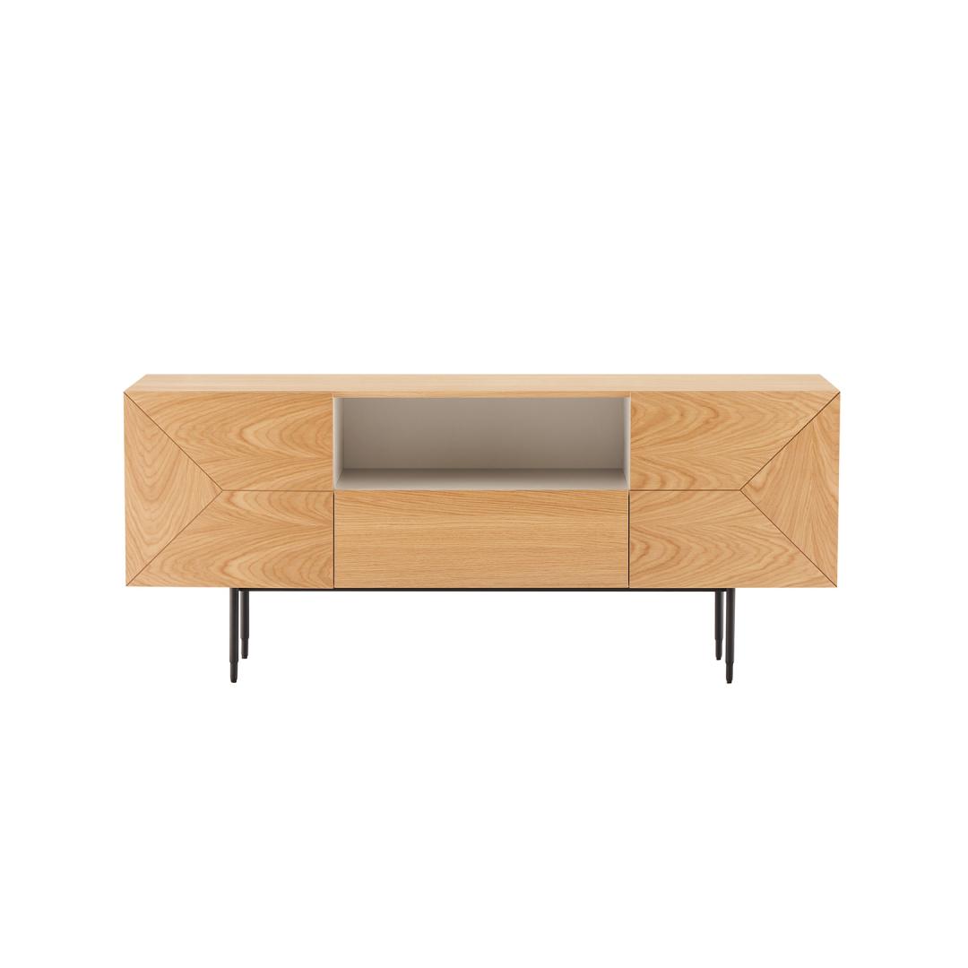 Kaapin runko on valmistettu huonekalulevystä, jossa on ulkoa luonnon tammiviilua ja sisältä valkoista melamiinia. Ovet ja laatikon etuosa on valmistettu MDF-levystä, jonka ulkopinnassa on geometrinen kuvio, joka leikittelee puun värin kanssa ja tuo esiin luonnonmateriaalin kauneuden.