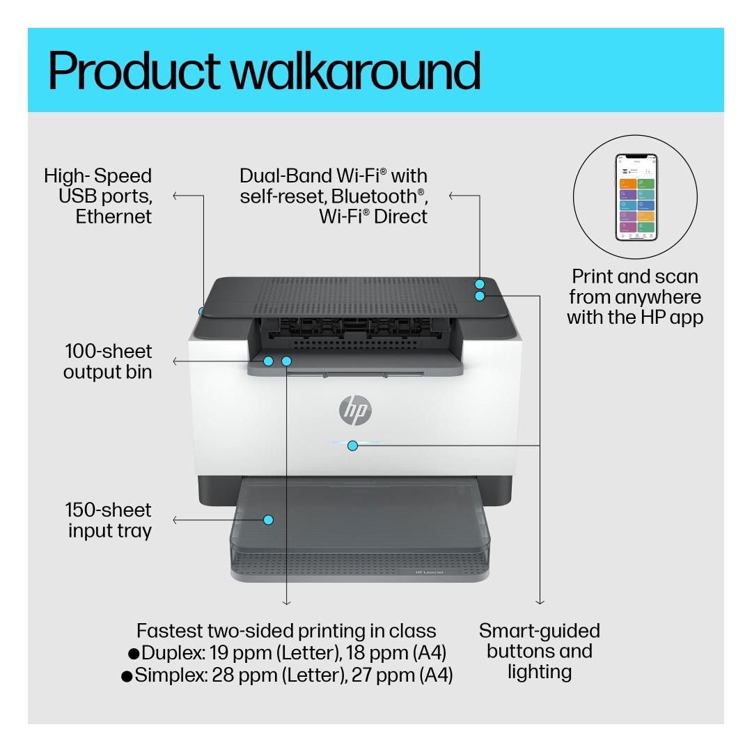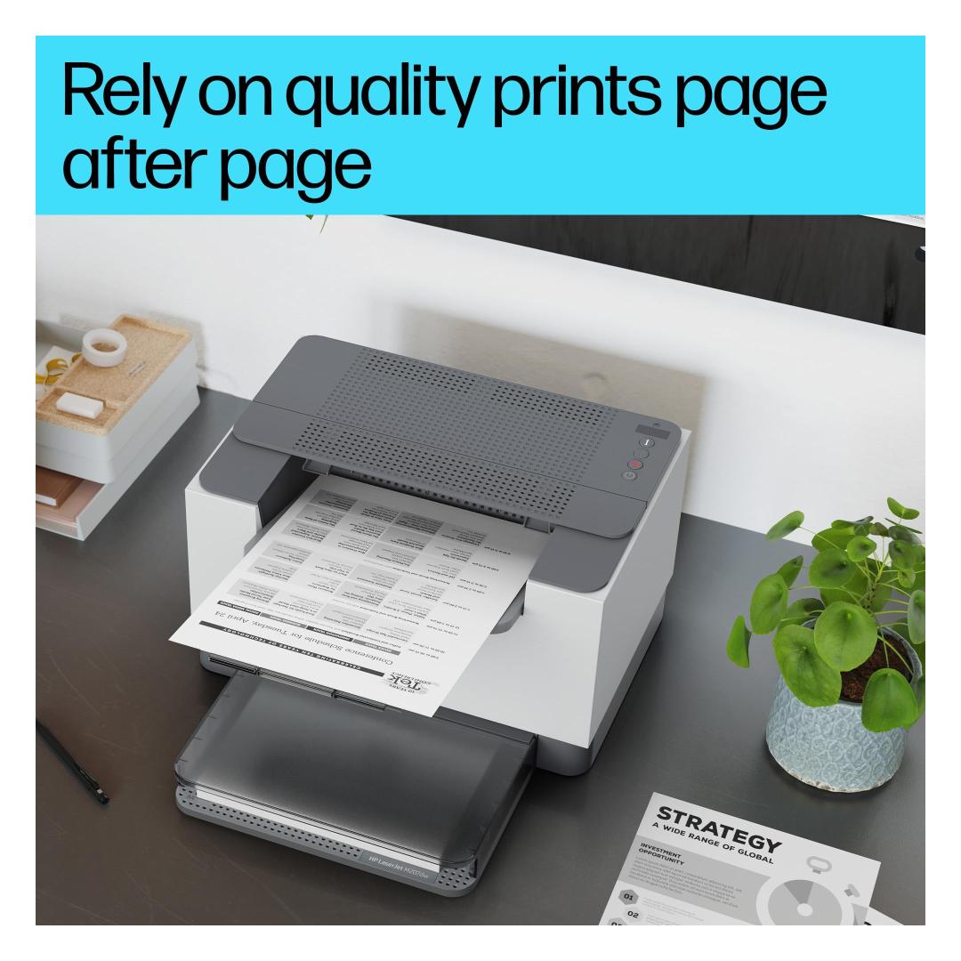 Nopea ja luotettava suorituskyky. Poikkeuksellinen arvo. Lisää tuottavuutta tällä palkittuun kompaktiin muotoiluun perustuvalla huipputehokkaalla mustavalkotulostimella.[3] Koe luokkansa nopein kaksipuolinen tulostus[9] ja luotettava Wi-Fi, jossa on itsestään palautuva nollaus,[1] sekä yksinkertaistetut asetukset ja aikaa säästävät ominaisuudet HP-sovelluksen avulla.[3]
