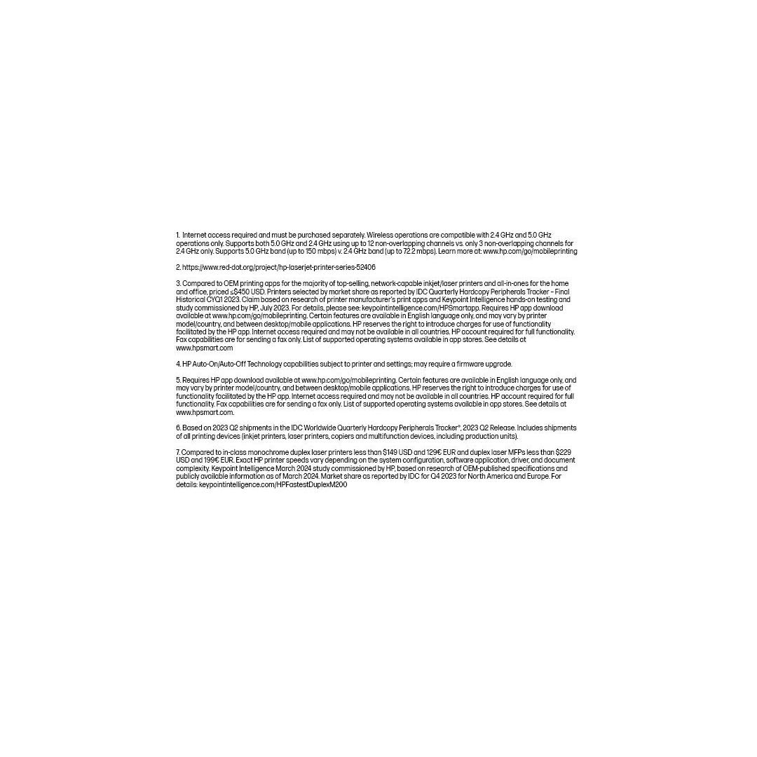 [9] Verrattuna luokkansa yksivärisiin monokromisiin kaksipuolisiin lasertulostimiin, joiden hinta on alle 119 €, ja kaksipuolisiin monitoimilasertulostimiin, joiden hinta on alle 179 €. Tarkat HP-tulostimen nopeudet vaihtelevat järjestelmän kokoonpanon, ohjelmistosovelluksen, ohjaimen ja asiakirjan monimutkaisuuden mukaan. Keypoint Intelligencen maaliskuun 2024 tutkimus HP:n toimeksiannosta, joka perustuu alkuperäisten laitevalmistajien julkaisemien spesifikaatioiden ja julkisesti saatavilla olevien tietojen tutkimukseen maaliskuussa 2024. IDC:n raportoima markkinaosuus Q4 2023 Pohjois-Amerikan ja Euroopan osalta. Lisätietoja: keypointintelligence.com/HPFastestDuplexM200