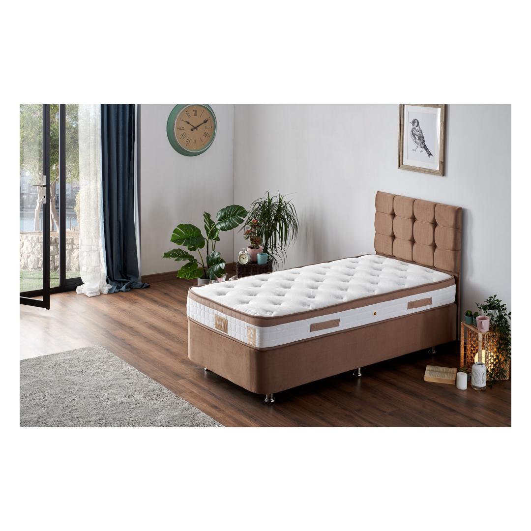 Kogege hotelli luksust oma kodu mugavuses meie üheinimese madratsi, aluse ja peatoe komplektiga. See peen komplekt on loodud selleks, et pakkuda teile ülimat magamiskogemust, tagades, et ärkate igal hommikul värskendatuna ja noorendatuna. Lõbutsege võrratu mugavusegaMeie üheinimesemadrats on valmistatud mitme vedruga süsteemi ja täieliku ortopeedilise toega, mis tagab teie kehale optimaalse mugavuse ja toe. Vajutage plüšseeritud kootud kangakattesse ja tundke, kuidas päevane stress sulab minema, kui vajute rahulikku unne.Elegantne disain keerukasse magamistuppaVoodipõhja ja peatoe sile terasraam lisab elegantset elegantsust igale magamistoa sisustusele. Komplekti helepruun värvus õhkab soojust ja elegantsi, luues hubase ja kutsuva atmosfääri. Kindel ja usaldusväärne konstruktsioonVoodipõhi on valmistatud tugeva terasprofiili ja mdf-servadega, mis tagab pikaajalise vastupidavuse ja stabiilsuse. Kuus jalga, mille kõrgus on 10 cm, pakuvad täiendavat tuge ja hoiavad ära vajumise. Voodipõhjal on ka turvalukk ja õhukapsel, mis lisab mugavust ja mugavust. Tehnilised üksikasjad:Raam: TerasestKangas: Soho kangas: 100% Soho kangasVoodipõhja mõõtmed: Laius: 90 cm, kõrgus: 38 cm, sügavus: 190 cm.Peaplaadi mõõtmed: 1,5 mm: Laius: 90 cm, kõrgus: 100 cm, sügavus: 5 cmVoodipõhja kõrgus: 28 cmJalgade kõrgus: 10 cmKuus jalga lisavad stabiilsustVoodipõhja õhukapsel suurendab mugavustTurvalukk lisamugavuse tagamiseksKaasas kirst täiendava hoiuruumi jaoksMadratsi mõõtmed: Laius: 90 cm, kõrgus: 23 cm, sügavus: 190 cm.Kate: Kangas: Kootud kangasMulti Spring System optimaalse toe tagamiseksTäielik ortopeediline madrats tagab ülima mugavuse ja lõõgastumise.Värvus: helepruun Värv: Light Brown