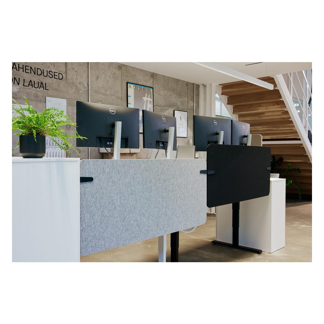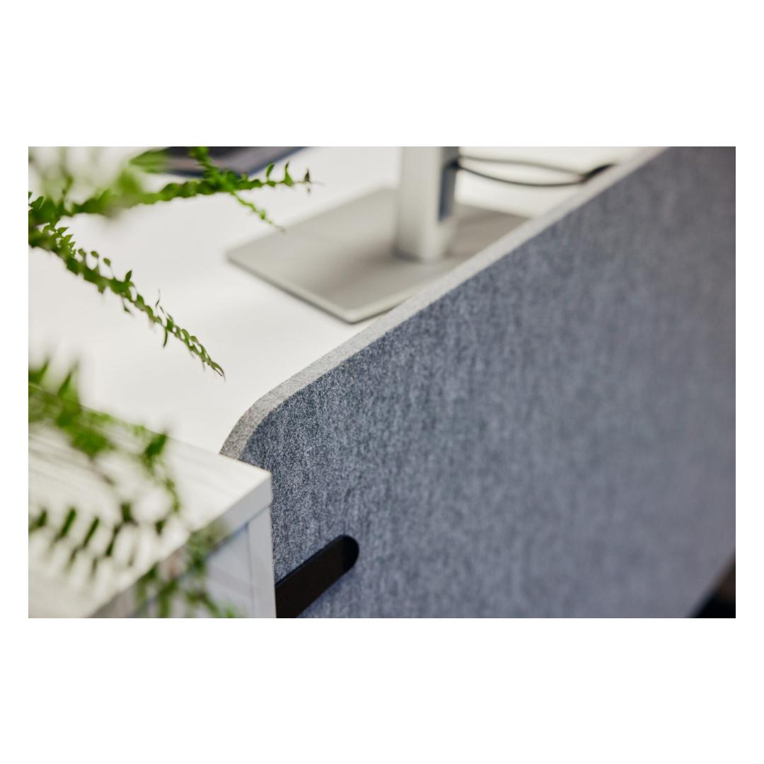 MUTEK-huopapöytäsuoja vähentää melusaastetta avokonttoreissa toimimalla tilanjakajana ja myös sisustuselementtinä, jolla on varjostustoiminto. Näyttöjä on saatavana sekä neliö- että säteittäisenä (kulma R55) versiona. Molempia on saatavana kolmessa koossa, joissa on erilaisia etu- ja sivusäleiden yhdistelmiä.0