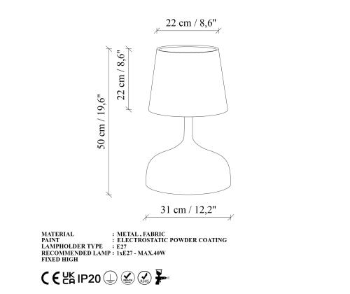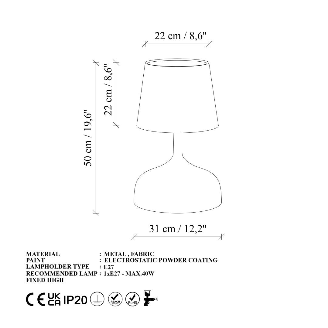 Valgustage oma ruumi meie kauni metallkehaga lauavalgustiga. See elegantne lamp omab sujuvat metallkeha ja kangast katet, luues sooja ja kutsuva atmosfääri igas toas. Stiili ja funktsionaalsuse ideaalne kombinatsioon, see lamp lisab teie kodu sisustusele peenust.Elegantne DisainMetallkehaga lauavalgusti uhkeldab modernse ja rafineeritud disainiga, mis täiustab igat ruumi. Musta ja pruuni värvikombinatsioon lisab ruumile elegantsi, samas kui kangast kate pehmendab valgust, luues hubase õhkkonna.Mugavad OmadusedSuurusega 31 x 31 x 50 cm ja katte suurusega Ø22-28 h:22 cm on see lamp ideaalne igale lauapinnale. 200 cm pikkune kaabel ja sisse/välja lülitusnupp muudavad valgustuse kontrollimise lihtsaks, samas kui 1 x E 27 Max 40 W sokli tüüp võimaldab mitmekesiseid pirnivalikuid.Tehnilised Üksikasjad:Materjal: Metallkeha, Kangas KateSuurus: 31 x 31 x 50 cmKatte Suurus: Ø22-28 h:22 cmKaabli Pikkus: 200 cmSokli Tüüp: 1 x E 27 Max 40 WPirn ei ole kaasasPinge: 220-240 VIP Kood: IP20Värv: Must ja Pruun Värv: Black Brown