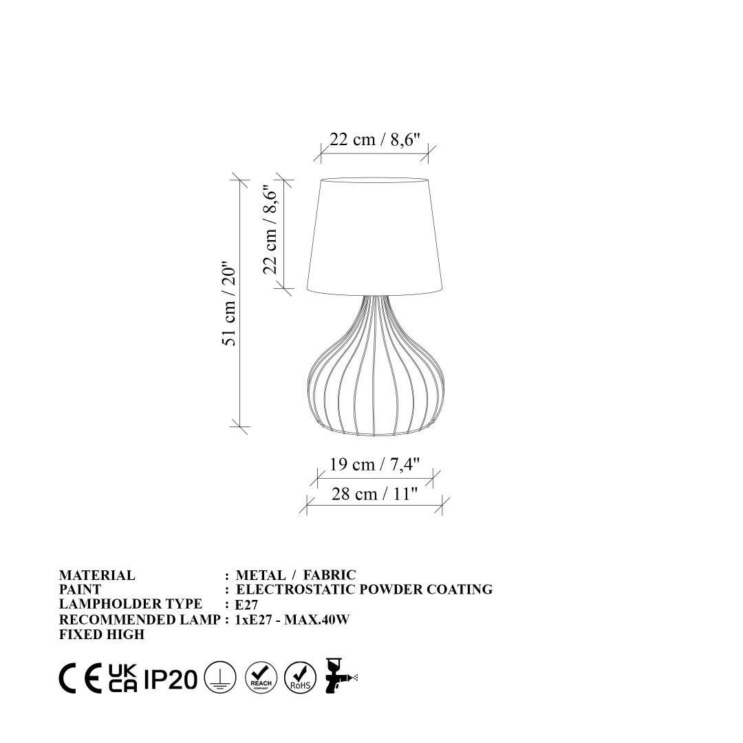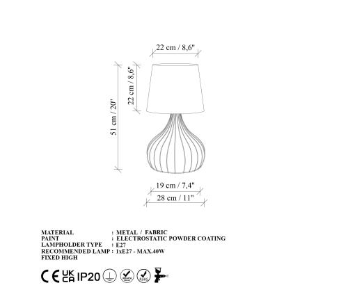 Valgustage oma ruumi elegantsi ja stiiliga meie hämmastava metallkorpusega lauavalgustiga. See kaunis lamp omab sujuvat metallkorpust koos kangast kattega, luues täiusliku segu modernsetest ja klassikalistest disainielementidest. Kuldse ja valge värvikombinatsioon lisab igasse ruumi natuke rafineeritust, muutes selle mitmekülgseks osaks, mis sobib igasuguse sisustusega.Parandage oma kodu sisustustLisage oma elutuppa, magamistuppa või kontorisse luksuse puudutus selle kauni lauavalgustiga. Ahnuslik disain ja kvaliteetsed materjalid muudavad selle silmapaistvaks osaks, mis tõstab teie kodu sisustust ja loob sooja ning kutsuva atmosfääri.Looge hubane õhkkondOlgu te lugemas raamatut, töötamas arvutiga või lihtsalt lõõgastumas, see lauavalgusti pakub täiuslikku valgust, et luua hubane õhkkond. Pirni pehme kuma (ei ole kaasas) lisab teie ruumile sooja ja sõbraliku tunde, muutes selle ideaalseks valgustuslahenduseks igaks juhuks.Tehnilised andmed:Metallkorpus kangast kattegaSuurus: 28 x 28 x 51 cmKatte suurus: Ø22-28 h:22 cmPesatüüp: 1 x E 27 Max 40 WPirn ei ole kaasas220-240 VIP kood: IP20Värv: Kuldne ja valge Värv: Gold White