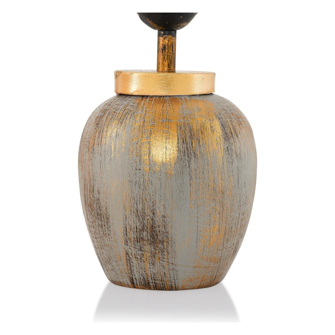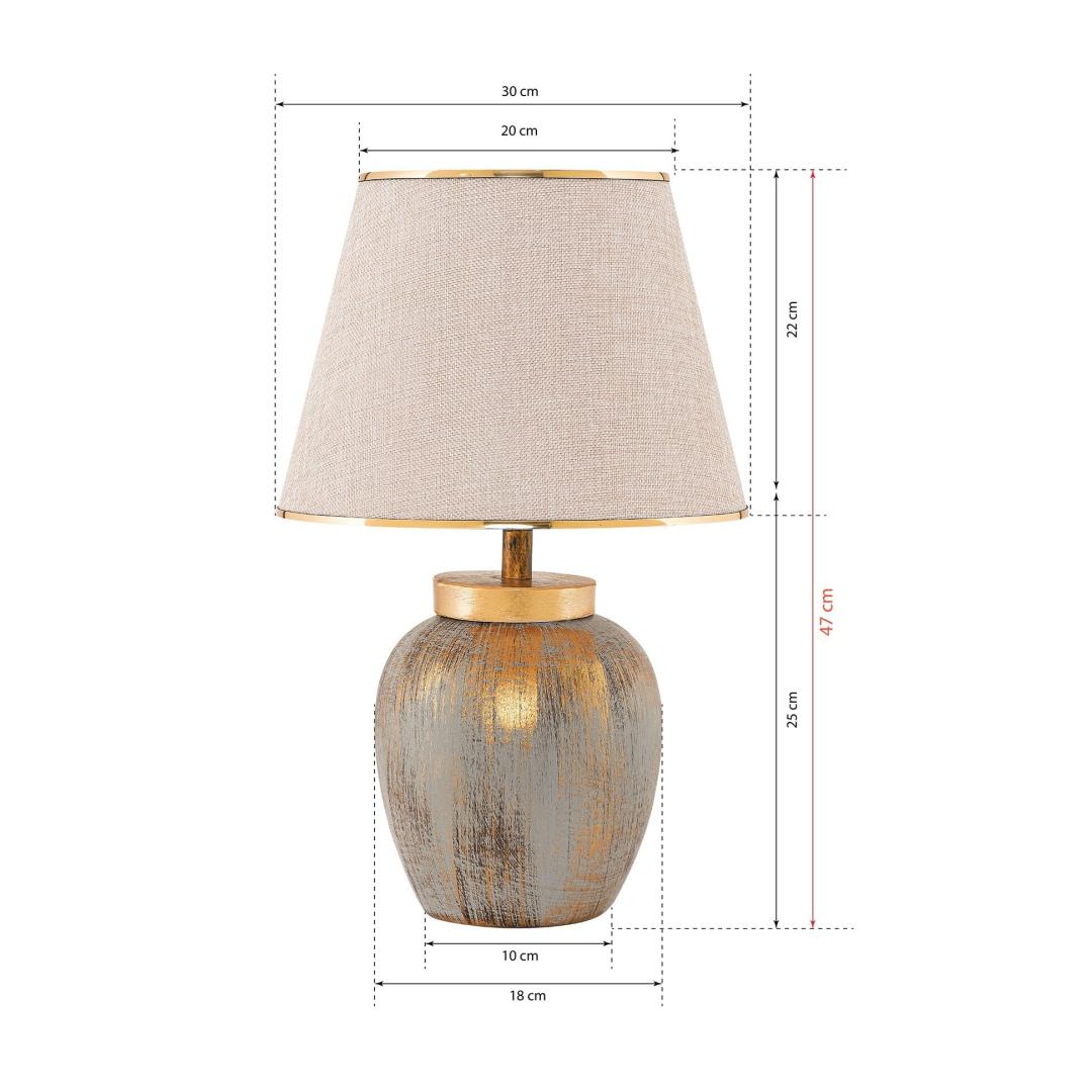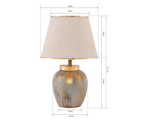 Valgustage oma ruumi elegantsi ja stiiliga meie kauni keraamilise laualambiga. See erakordne lamp on varustatud kauni keraamilise korpusega ajatu kreemi ja kuldse värvikombinatsiooniga, lisades igasse ruumi natuke rafineeritust. Kangast kuppel loob pehme ja kutsuva kuma, luues teie kodus sooja ja hubase atmosfääri.Elegantne disainLambi keraamiline korpus kiirgab luksust ja võlu, muutes selle ideaalseks lisandiks teie elutuppa, magamistuppa või kontorisse. Kreemi ja kuldse värvid sulanduvad harmooniliselt, luues elegantse ja ühtse ilme, mis täiustab igasugust sisustust.Pehme valgustusLambi kangast kuppel hajutab valgust pehmelt, luues teie ruumis sooja ja kutsuva õhkkonna. Olgu te lugemas raamatut, töötamas sülearvutiga või lihtsalt lõõgastumas, see lamp pakub igaks juhuks ideaalset valgustust.Perfect SizeLaiusega 18 cm ja kõrgusega 47 cm (koos kupliga) on see laualamp ideaalne suurus igasugustele laudadel või öökappidena. Kupli laius 30 cm tagab, et valgus jaotub ühtlaselt, valgustades teie ruumi kaunilt.Tehnilised andmed:Materjal: Keraamiline korpus, kangast kuppelLaius: 18 cmKõrgus: 47 cm (koos kupliga)Kupli laius: 30 cmPesatüüp: E27, max 40WVärv: Kreem ja kuld Värv: Cream Gold