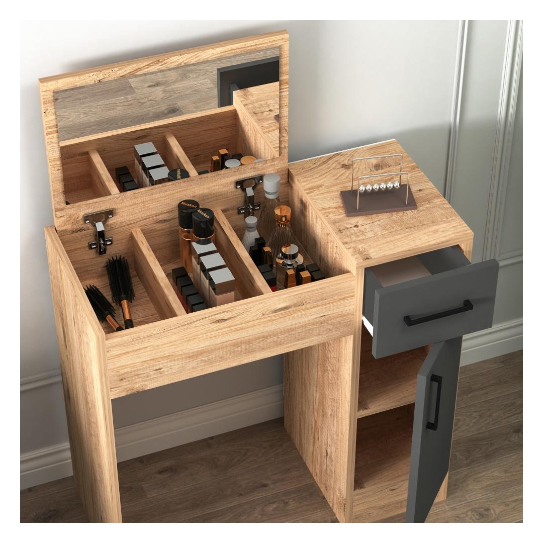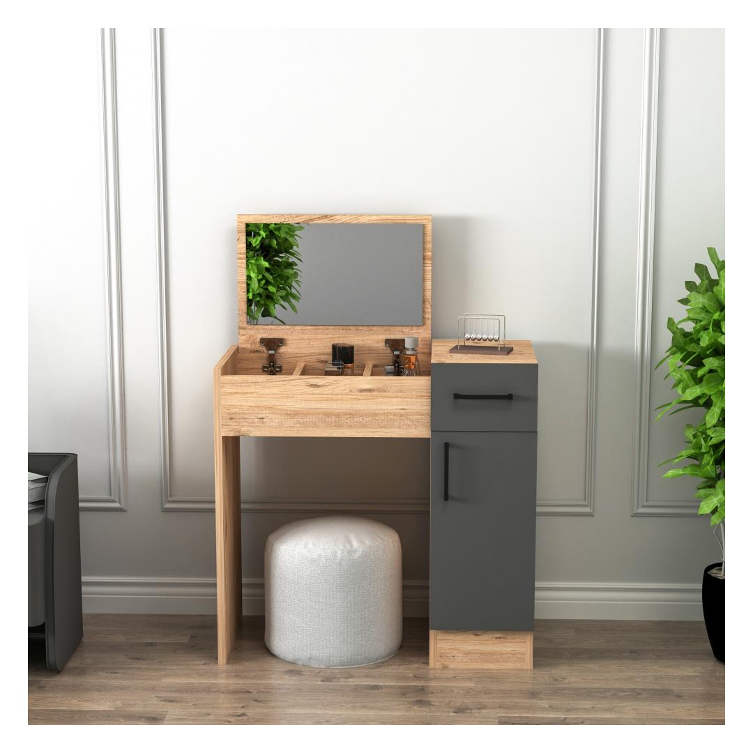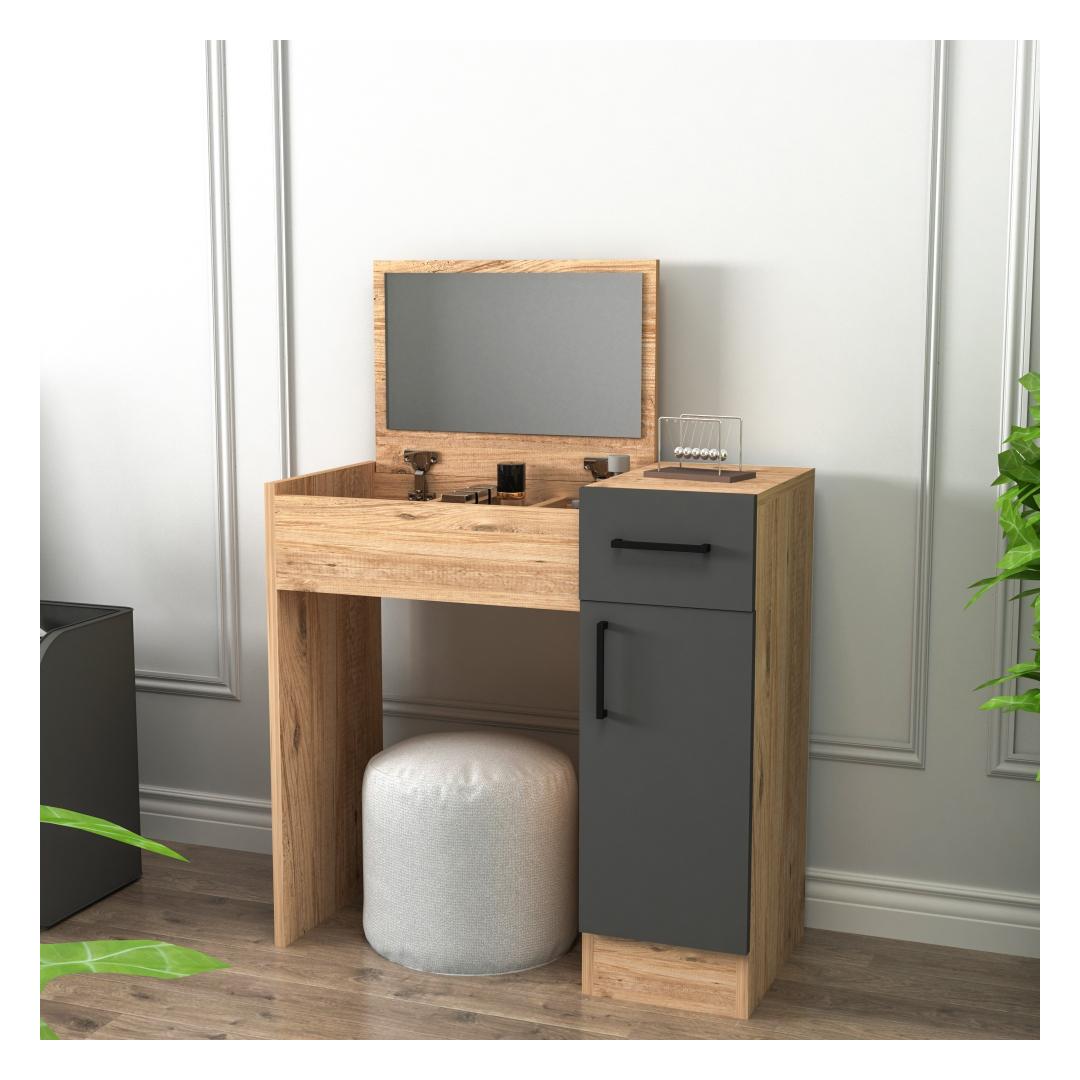 Muuda oma hommikurutiin meie kauni meigilaudaga, mis on loodud armastuse ja detailidele tähelepanu pööramisega. Sujuv disain ja elegantne värvikombinatsioon Atlandi mändi ja antratsiidi toovad sinu magamistuppa või riietusruumi natuke rafineeritust.Paranda oma ilu rituaaliKujuta ette, et istud sellel kaunil meigilaud, ümbritsetud kõigist oma lemmik ilu toodetest. Avardunud laudpind pakub piisavalt ruumi sinu kosmeetikatoodetele, pintslitele ja aksessuaaridele, muutes igapäevase ideaalse välimuse loomise lihtsaks.Korralda oma ruumÜtle hüvasti segastele tööpindadele ja kaootilistele sahtlitele. Meie meigilaud on varustatud piisava hoiuruumiga sahtlite ja riiulitega, võimaldades sul hoida kõik korralikult organiseeritud ja käeulatuses. Hoia end organiseerituna ja säästa aega hommikul valmides.Kvaliteetne käsitööValmistatud 100% melamiinkattega puitlaastplaadist, on see meigilaud loodud kestma. 18mm paksus tagab vastupidavuse ja stabiilsuse, nii et saad nautida oma uut vanityt aastaid.Tehnilised andmed:Materjal: 100% melamiinkattega puitlaastplaatPaksus: 18mmLaius: 77cmKõrgus: 108.8cmSügavus: 37.3cmVärv: Atlandi mänd ja antratsiitUuenda oma ilu rutiini ja lisa oma ruumile luksuse puudutus meie meigilaudaga. Tellige oma täna ja kogege, millist erinevust see teie igapäevases rutiinis võib teha. Värv: Atlantic Pine Anthracite